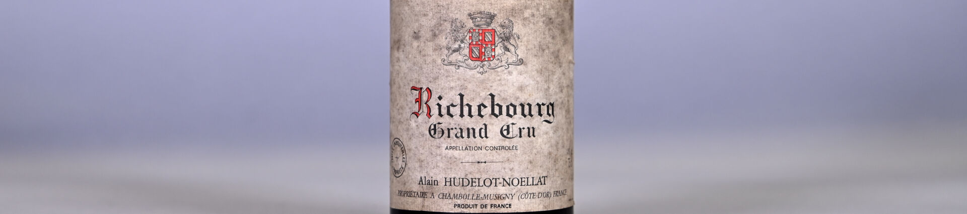 BOURGOGNE – 1 bouteille, Richebourg Grand Cru, Alain Hudelot-Noellat, 1987. 2,3 cm. Capsule légèrement sale et légèrement déformée en son sommet. Collerette sale avec un petit point de décollement sur son côté gauche. Etiquette sale.