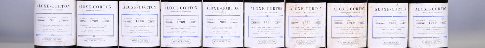 BOURGOGNE – 10 bouteilles, Aloxe-Corton, Perdrier Lavirotte, Marché aux Vins, 1980. Niveaux à 4,2 cm ou mieux. Capsules légèrement sales à sales dont une est abimée et une autre présente une déchirure en son sommet. Etiquettes légèrement sales à sales, légèrement abimées et avec des traces d’humidité.