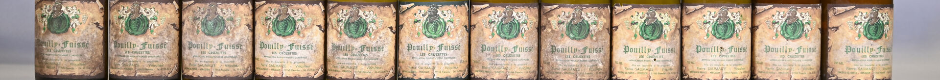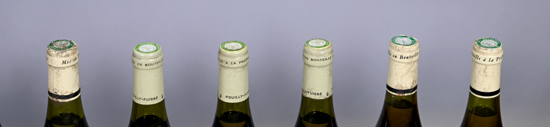 BOURGOGNE – 12 bouteilles, Pouilly-Fuissé ‘Les Cruzettes’, Pierre Saumaize, 1985 (7), 1986 (1) et millésime ? (4). Niveaux à 2,5 cm ou mieux. Capsules légèrement sales à sales. Collerettes légèrement sales et abimées avec des points de décollement ou entièrement décollées. Quatre collerettes manquantes. Etiquettes légèrement sales à sales.
