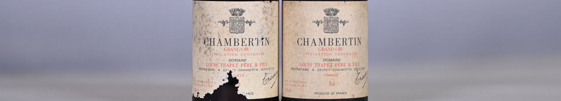BOURGOGNE – 2 bouteilles, Chambertin Grand Cru, Domaine Louis Trapet père et fils, 1982. 2,5 cm et 3,2 cm. Capsules avec des traces et légèrement déformées en leur sommet. Collerettes légèrement sales avec des traces d’humidité. Etiquettes légèrement sales à sales avec des traces d’humidité et dont une est dégradée.