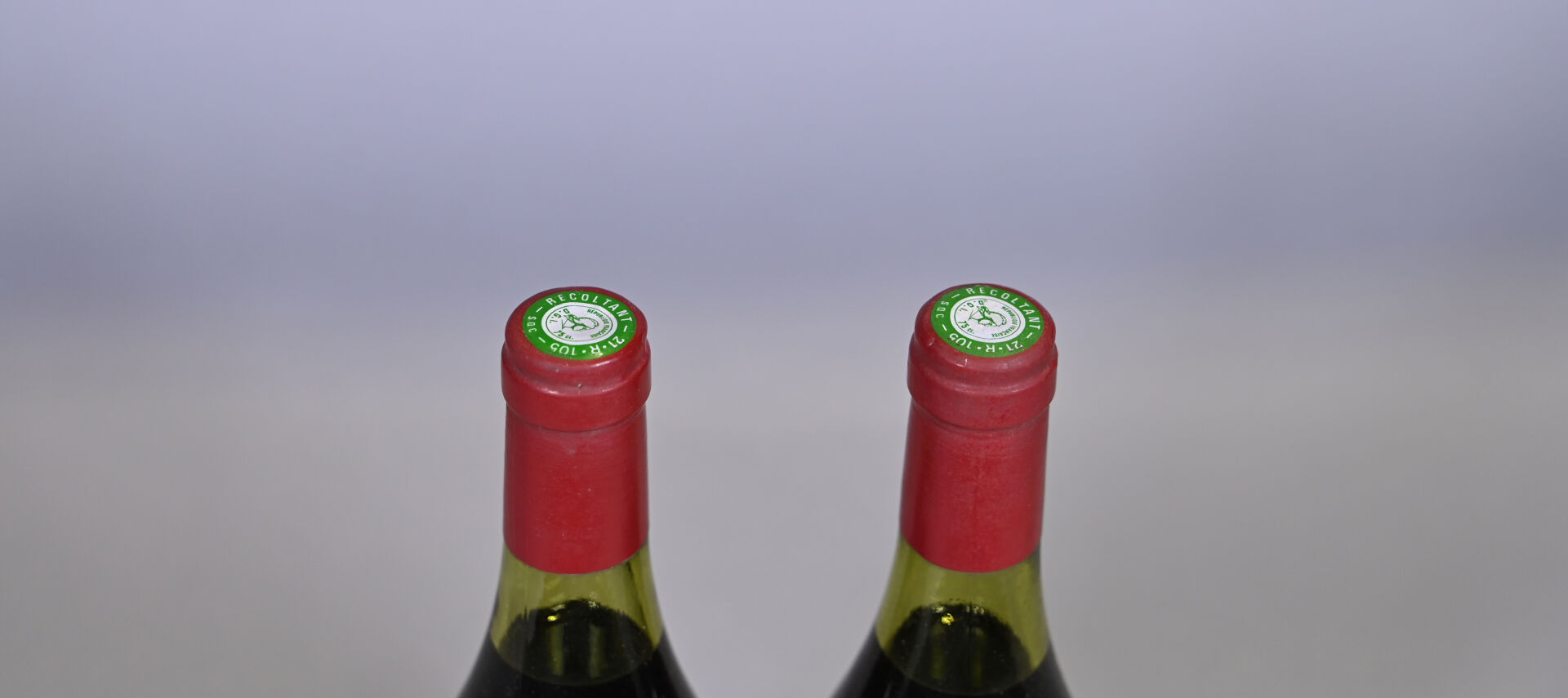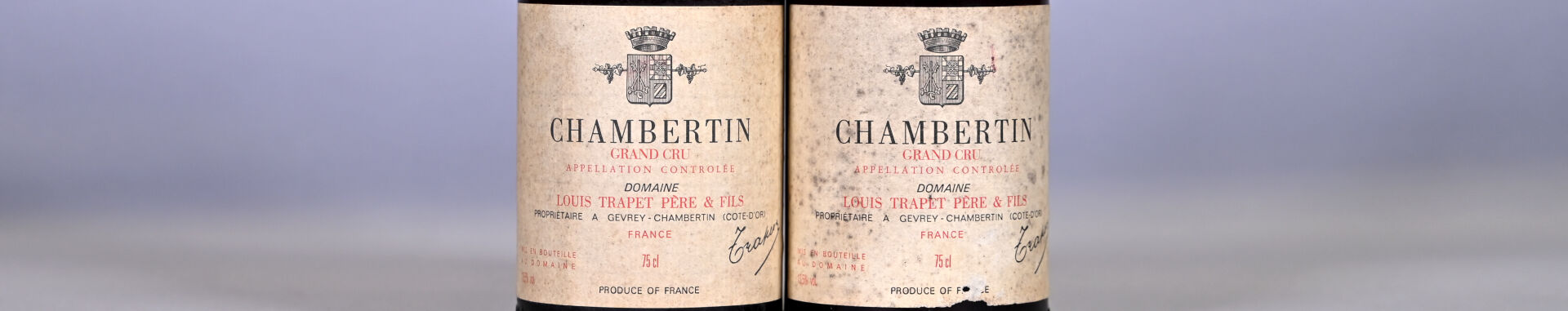 BOURGOGNE – 2 bouteilles, Chambertin Grand Cru, Domaine Louis Trapet père et fils, 1982. 2,8 cm et 3,2 cm. Capsules avec des traces et légèrement déformées en leur sommet. Collerettes légèrement sales avec des traces d’humidité. Etiquettes légèrement sales à sales avec des traces d’humidité et dont une est légèrement abimée.