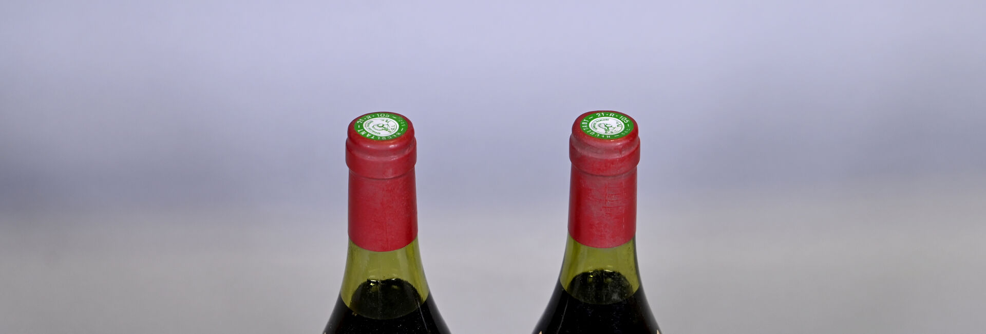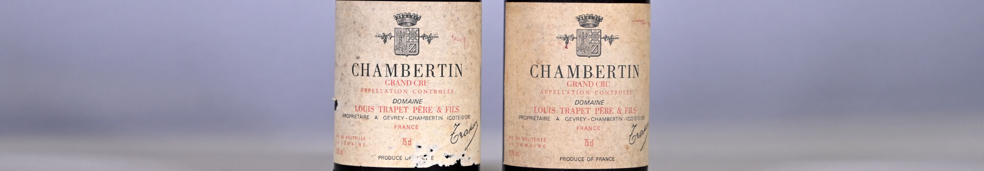BOURGOGNE – 2 bouteilles, Chambertin Grand Cru, Domaine Louis Trapet père et fils, 1982. 2,8 cm et 3,3 cm. Capsules avec des traces et légèrement déformées en leur sommet. Collerettes légèrement sales avec des traces d’humidité. Etiquettes légèrement sales à sales avec des traces d’humidité et dont une est abimée.