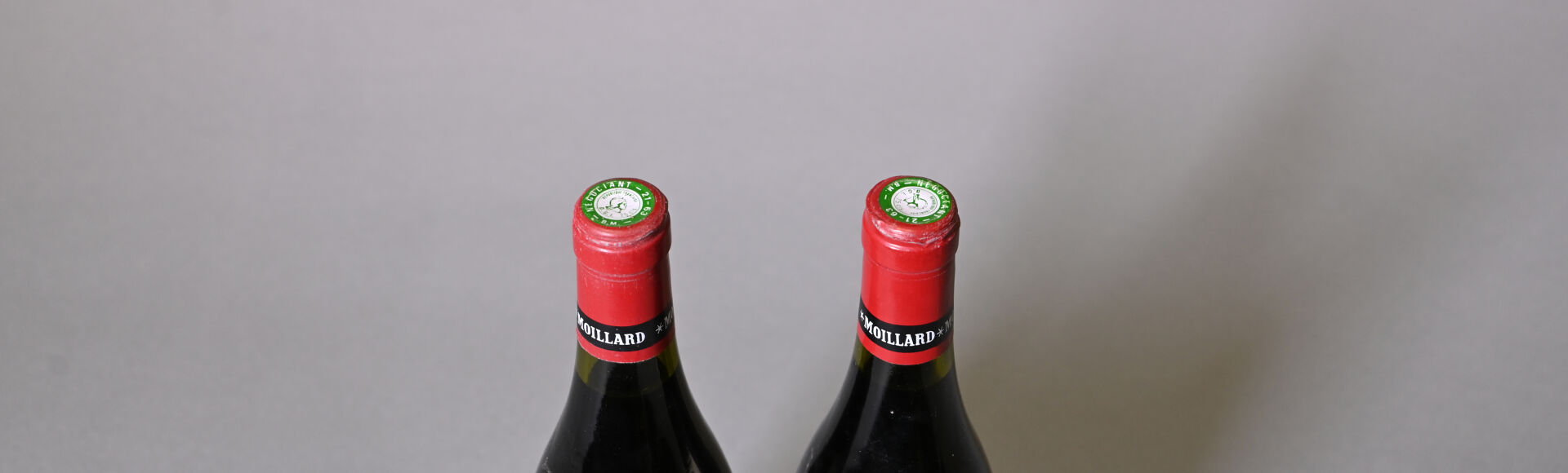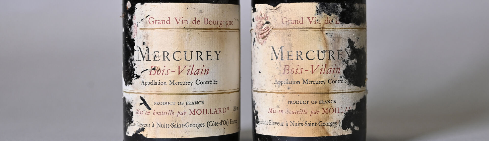 BOURGOGNE – 2 bouteilles, Mercurey ‘Bois-Vilain’, Moillard, 1990. Capsules légèrement sales. Collerettes légèrement sales dont une est abimée. Etiquettes légèrement sales à sales et dégradées avec des manques. Contre-étiquettes sales dont une est dégradée.