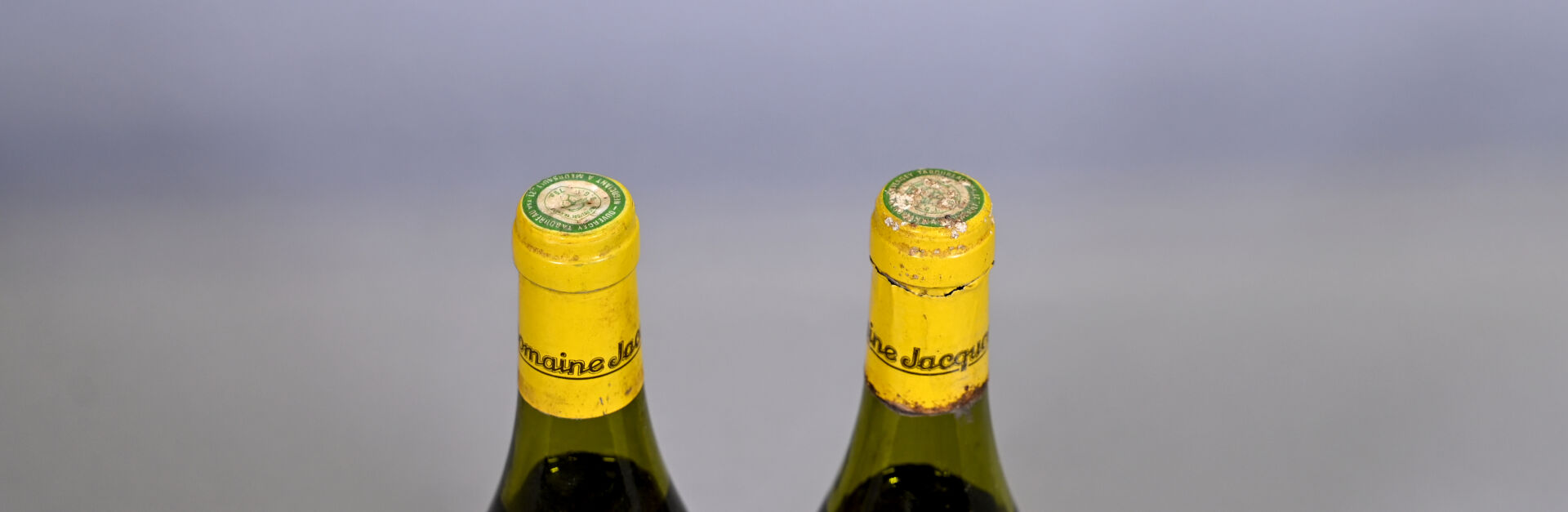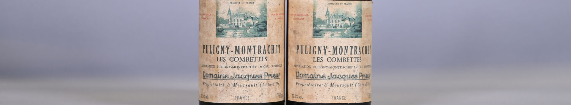 BOURGOGNE – 2 bouteilles, Puligny-Montrachet 1er Cru ‘Les Combettes’, Domaine Jacques Prieur, 1984 (1) et millésime ? (1). Niveaux à 3,7 cm et 4,5 cm. Capsules sales dont une a été incisée pour les besoins de l’expertise. Etiquettes sales.