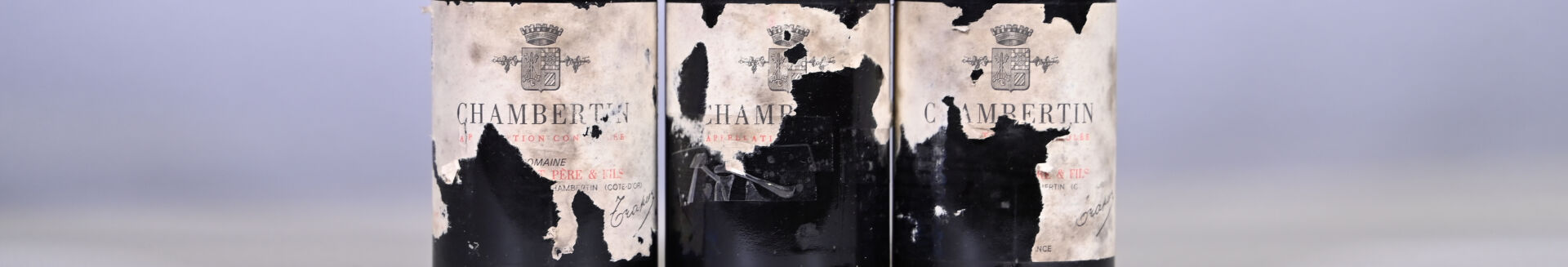 BOURGOGNE – 3 bouteilles, Chambertin Grand Cru, Domaine Louis Trapet père et fils, 1985. 2,3 cm, 2,4 cm et 2,5 cm. Une capsule légèrement incurvée. Collerettes sales et abimées à très abimées. Etiquettes sales et dégradées à très dégradées avec des manques importants à très importants.