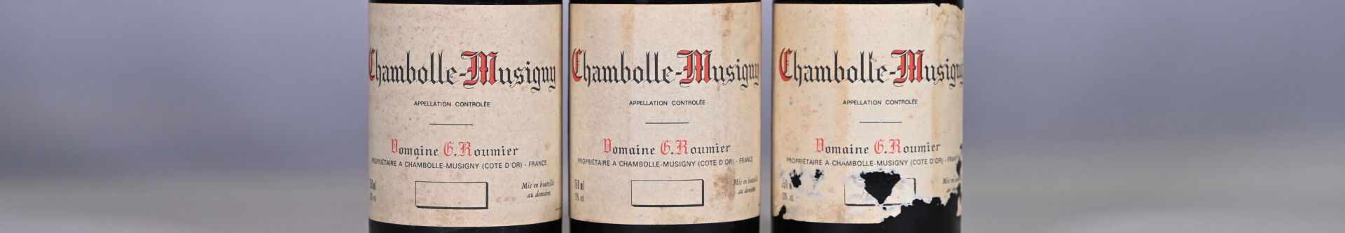 BOURGOGNE – 3 bouteilles, Chambolle-Musigny, Domaine Georges Roumier, 1985. 4,1 cm, 4,2 cm et 4,8 cm. Capsules légèrement déformées en leur sommet avec de légères traces de frottement. Collerettes légèrement sales dont une est partiellement décollée. Etiquettes légèrement sales dont une est dégradée.