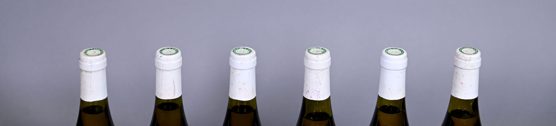 BOURGOGNE – 6 bouteilles, Meursault 1er Cru ‘Charmes’, Domaine Rougeot, 1990. Niveaux à 2,4 cm ou mieux. Capsules légèrement sales. Collerettes et étiquettes sales à très sales et dégradées à très dégradées.