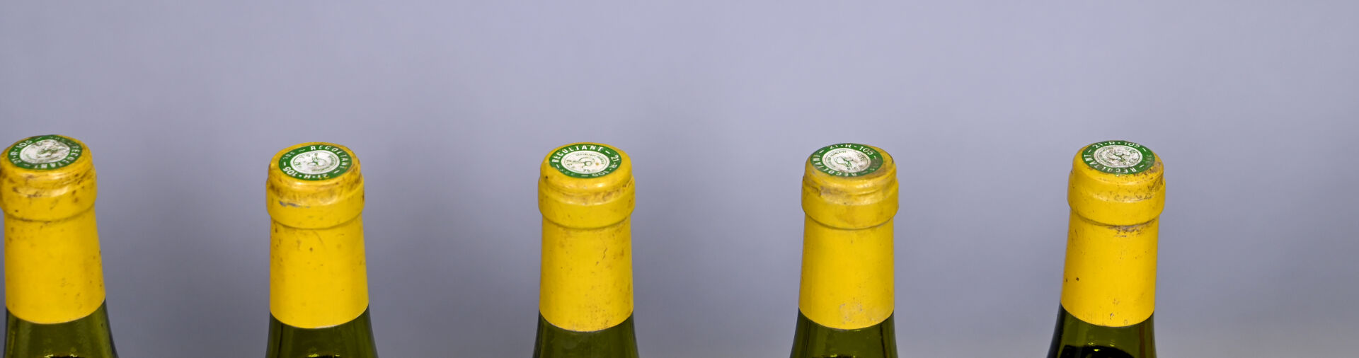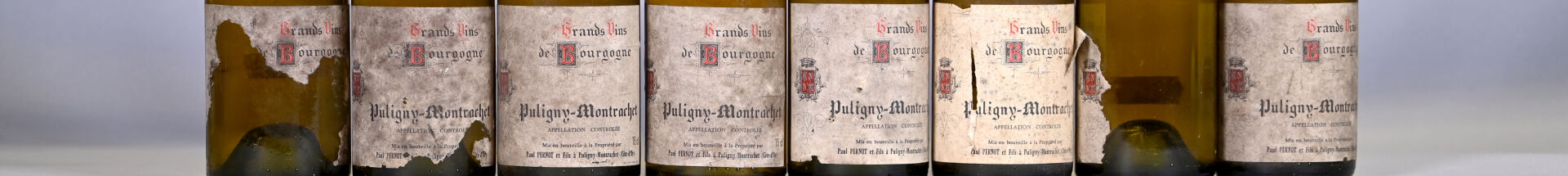 BOURGOGNE – 8 bouteilles, Puligny-Montrachet, Paul Pernot et ses fils, 1984 (dont 5 bouteilles sont supposées de ce millésime et deux de cette référence). Niveaux à 2,7 cm ou mieux. Capsules sales et déformées en leur sommet. Collerettes sales à très sales dont deux sont abimées, deux sont presque entièrement manquantes et deux sont manquantes. Etiquettes sales avec des traces d’humidité légèrement abimées à abimées dont une présente un manque très important et une autre est presque entièrement manquante.