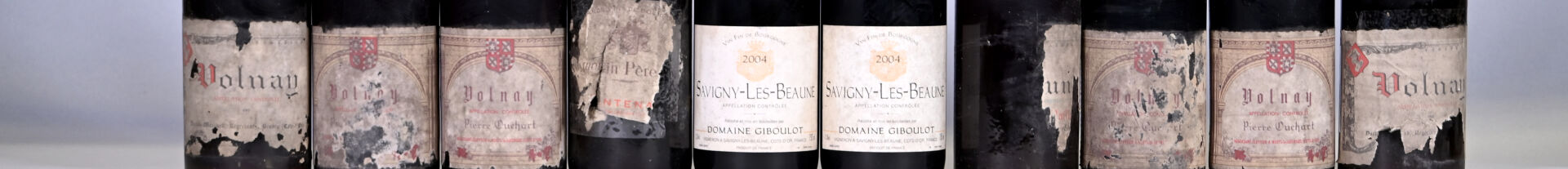 2 bouteilles, Savigny-les-Beaune, Domaine Giboulot, 2004. Capsules légèrement sales et incurvées.