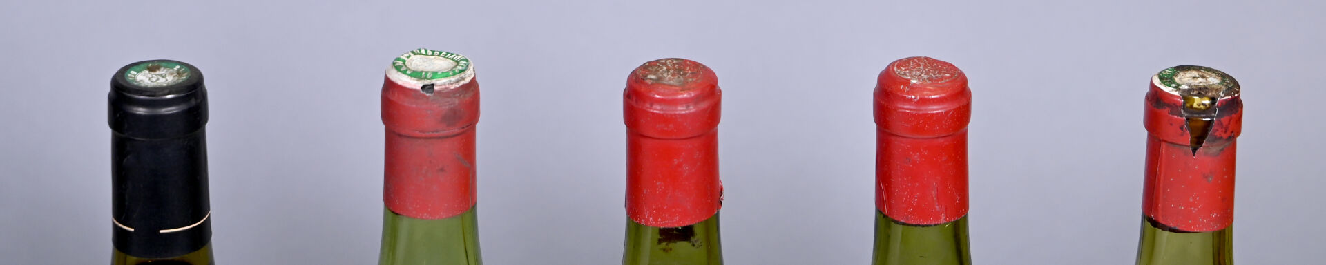 2 bouteilles, Volnay, Duclos-Maillard, 1964. 4 cm et 6,7 cm. Capsules légèrement sales à sales dont une présente une déchirure. Etiquettes sales et dégradées à très dégradées.