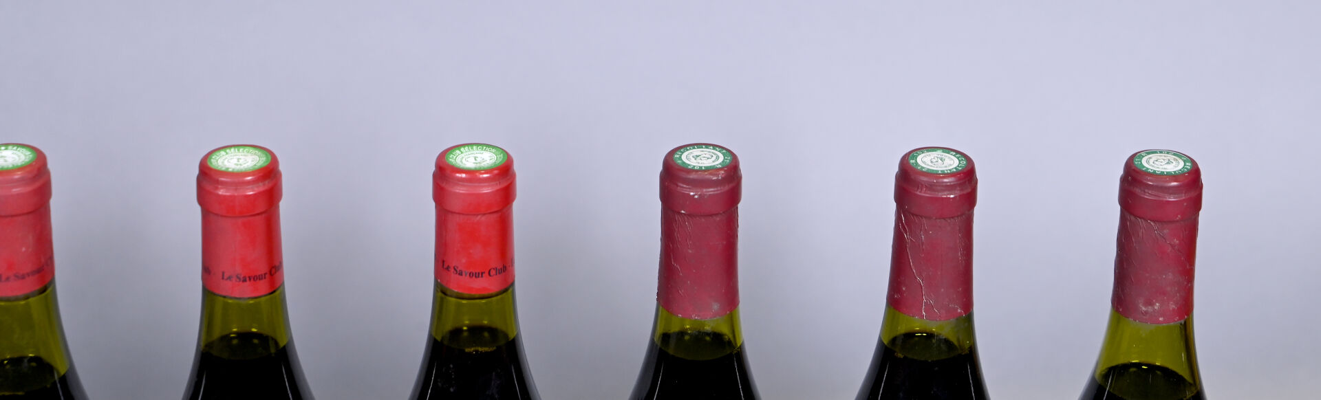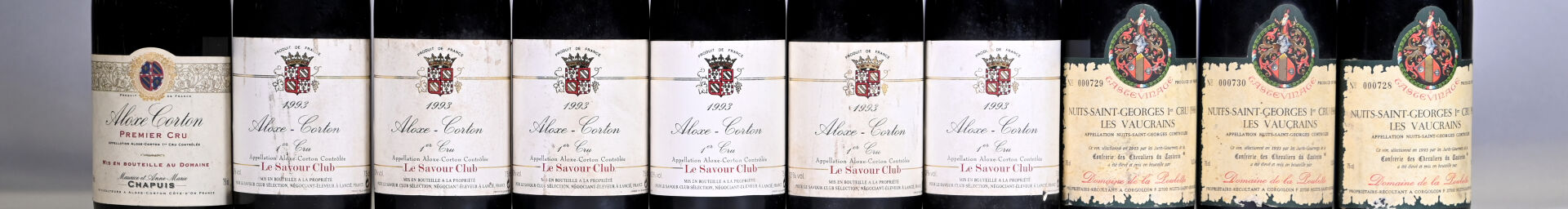 BOURGOGNE – Ensemble de 10 bouteilles composé de : 6 bouteilles, Aloxe-Corton 1er Cru, Le Savour Club, 1993. Un niveau à 2,5 cm et un niveau à 3,5 cm. Capsules avec des traces, incurvées et dont une est abimée. 1 bouteille, Aloxe-Corton 1er Cru, Chapuis, 1999. Etiquette avec de légères traces. 3 bouteilles, Nuits-Saint-Georges 1er Cru ‘Les Vaucrains’, Domaine de la Poulette, bouteilles tastevinées, 1988. Un niveau à 3 cm. Capsules légèrement sales. Etiquettes légèrement sales et légèrement abimées.