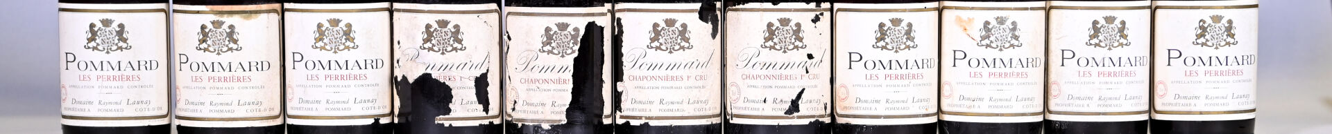 BOURGOGNE – Ensemble de 11 bouteilles composé de : 4 bouteilles, Pommard 1er Cru ‘Chaponnières’, Domaine Raymond Launay, 1979. Niveaux à 3,5 cm ou mieux. Capsules légèrement sales à sales et incurvées ou déformées en leur sommet. Collerettes légèrement sales à sales dont deux sont légèrement abimées à abimées. Etiquettes sales et dégradées. 7 bouteilles, Pommard ‘Les Perrières’, Domaine Raymond Launay, 1973 (dont deux bouteilles sont supposées de ce millésime). Niveaux à 5 cm ou mieux sauf une bouteille dont le niveau est à 7,5 cm. Capsules légèrement sales à sales et déformées en leur sommet. Collerettes légèrement sales à sales, légèrement abimées, dont deux sont partiellement décollées et deux sont manquantes.