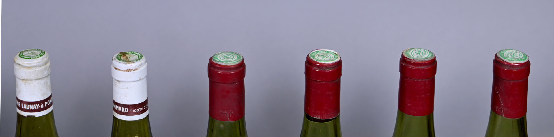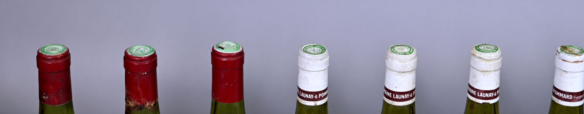 7 bouteilles, Pommard ‘Les Perrières’, Domaine Raymond Launay, 1973 (dont deux bouteilles sont supposées de ce millésime). Niveaux à 5 cm ou mieux sauf une bouteille dont le niveau est à 7,5 cm. Capsules légèrement sales à sales et déformées en leur sommet. Collerettes légèrement sales à sales, légèrement abimées, dont deux sont partiellement décollées et deux sont manquantes.