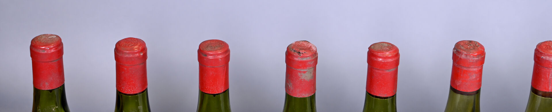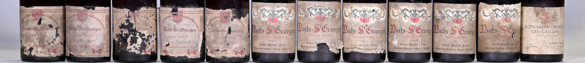 5 bouteilles, Nuits-Saint-Georges, Pierre Duchart, 1964. Un bouchon légèrement engagé. Niveaux à 5 cm ou mieux sauf un niveau à 7,3 cm. Capsules légèrement sales, déformées en leur sommet et dont une est également abimée. Ecussons sales, abimés et dont deux sont partiellement décollés. Etiquettes sales à très sales et dégradées à très dégradées.