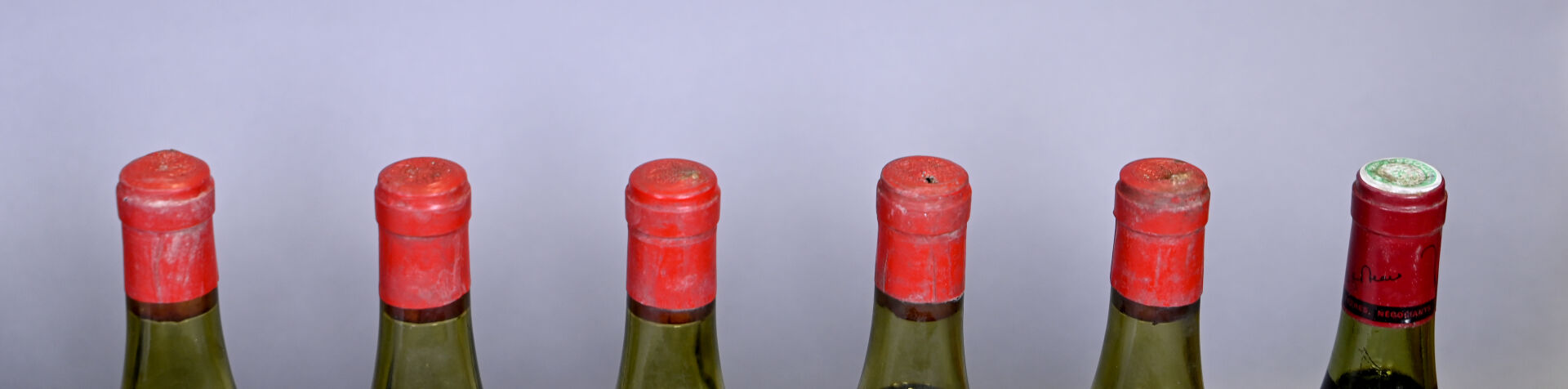 6 bouteilles, Nuits-Saint-Georges, Clopin-Mahault Frères, 1969. Bouchons légèrement engagés. Niveaux à 5,2 cm ou mieux. Capsules légèrement sales, déformées et abimées en leur sommet. Collerettes sales dont trois sont légèrement abimées. Etiquettes sales dont trois sont légèrement dégradées à dégradées.