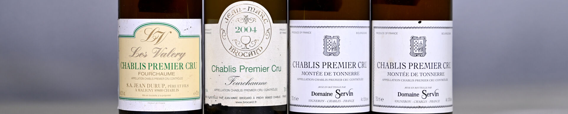 2 bouteilles, Chablis 1er Cru ‘Montée de Tonnerre’, Domaine Servin, 2007. Capsules avec des traces. Une étiquette avec une petite tache.