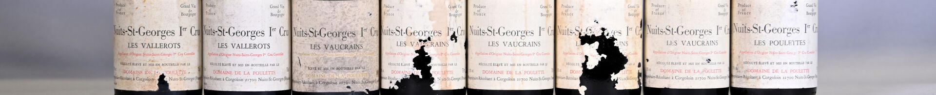 BOURGOGNE – Ensemble de 8 bouteilles composé de : 4 bouteilles, Nuits-Saint-Georges 1er Cru ‘Les Vaucrains’, Domaine de la Poulette, 1995. Niveaux à 2,3 cm (2), 2,7 cm et 3,7 cm. Capsules légèrement sales et légèrement incurvées. Collerettes légèrement sales et abimées. Etiquettes légèrement sales à sales dont trois sont légèrement dégradées à dégradées. 2 bouteilles, Nuits-Saint-Georges 1er Cru ‘Les Vallerots’, Domaine de la Poulette, 1988. Niveaux à 2 cm et 2,5 cm. Capsules avec des traces. Collerettes sales. Etiquettes sales dont une présente une déchirure. 1 bouteille, Nuits-Saint-Georges 1er Cru ‘Les Poulettes’, Domaine de la Poulette, 1988. Niveau à 2 cm. Capsule et collerette légèrement sales. Etiquette légèrement sale à sale et légèrement abimée. 1 bouteille, Nuits-Saint-Georges 1er Cru ‘Les Vaucrains’, Domaine de la Poulette, 1978. Niveau à 5 cm. Capsule et collerette sales. Etiquette sale et légèrement abimée.