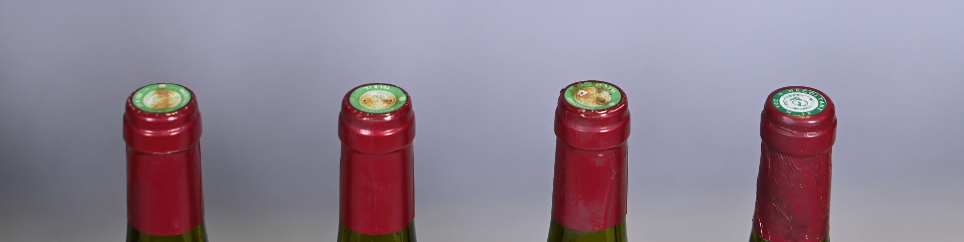 4 bouteilles, Nuits-Saint-Georges 1er Cru ‘Les Vaucrains’, Domaine de la Poulette, 1995. Niveaux à 2,3 cm (2), 2,7 cm et 3,7 cm. Capsules légèrement sales et légèrement incurvées. Collerettes légèrement sales et abimées. Etiquettes légèrement sales à sales dont trois sont légèrement dégradées à dégradées.