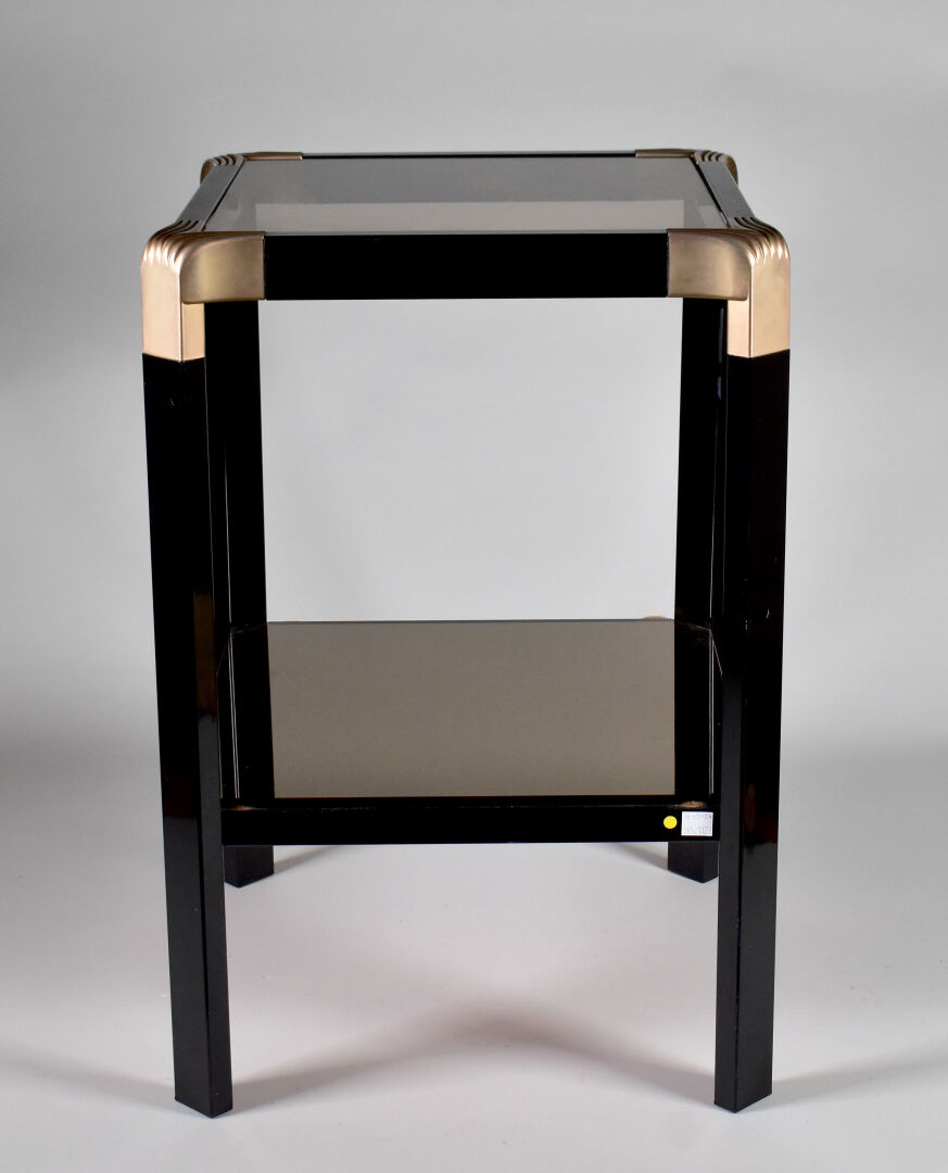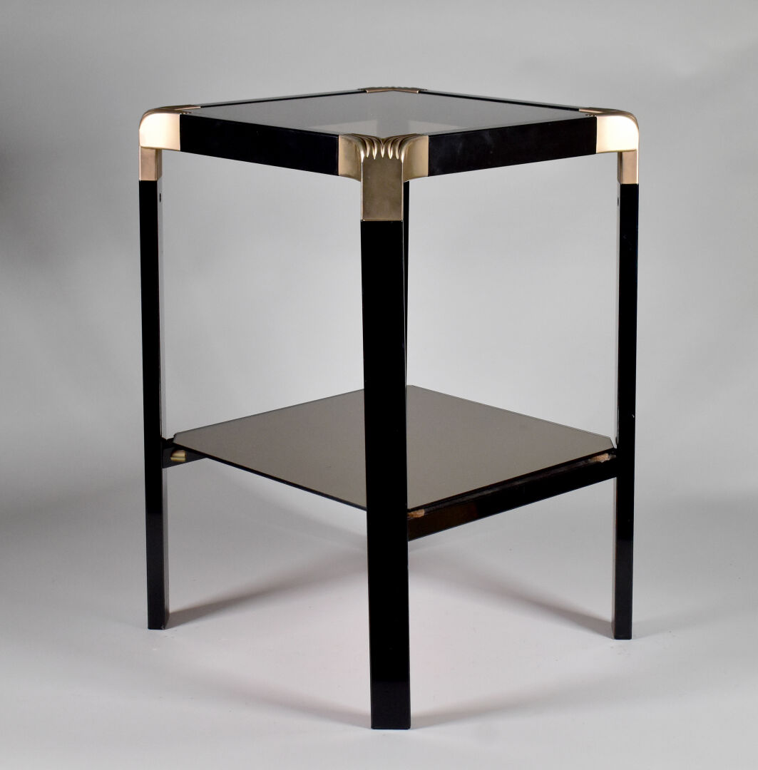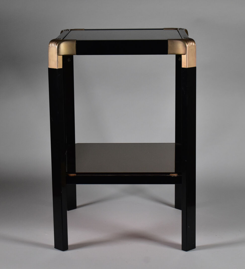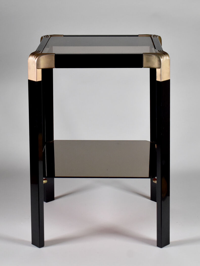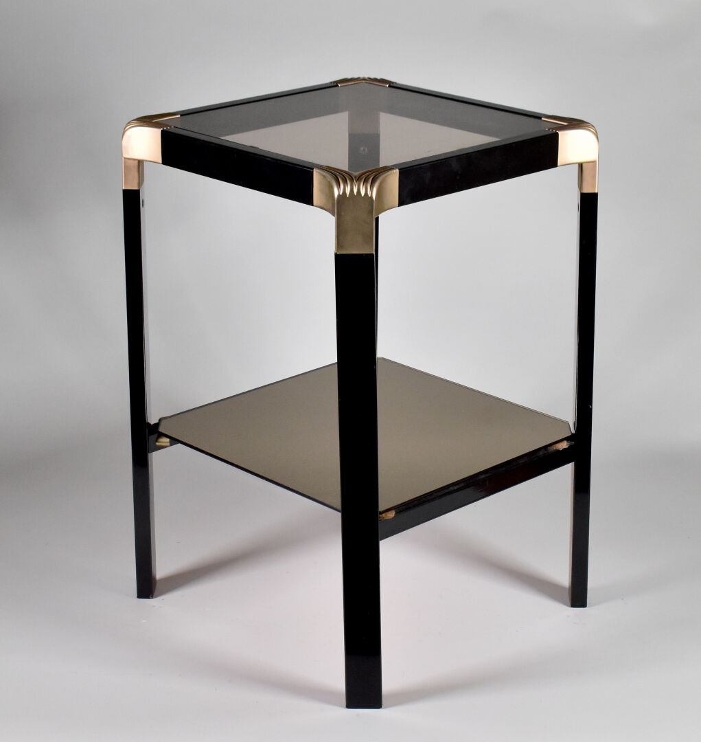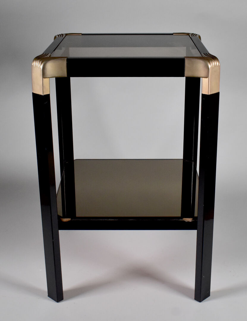 Bout de canapé en métal laqué brun et or dans les angles. Double plateau de verre, celui du bas à fond de glace. Vers 1980. Haut. : 59,5 cm – Larg. : 41 cm – Prof. : 41 cm.