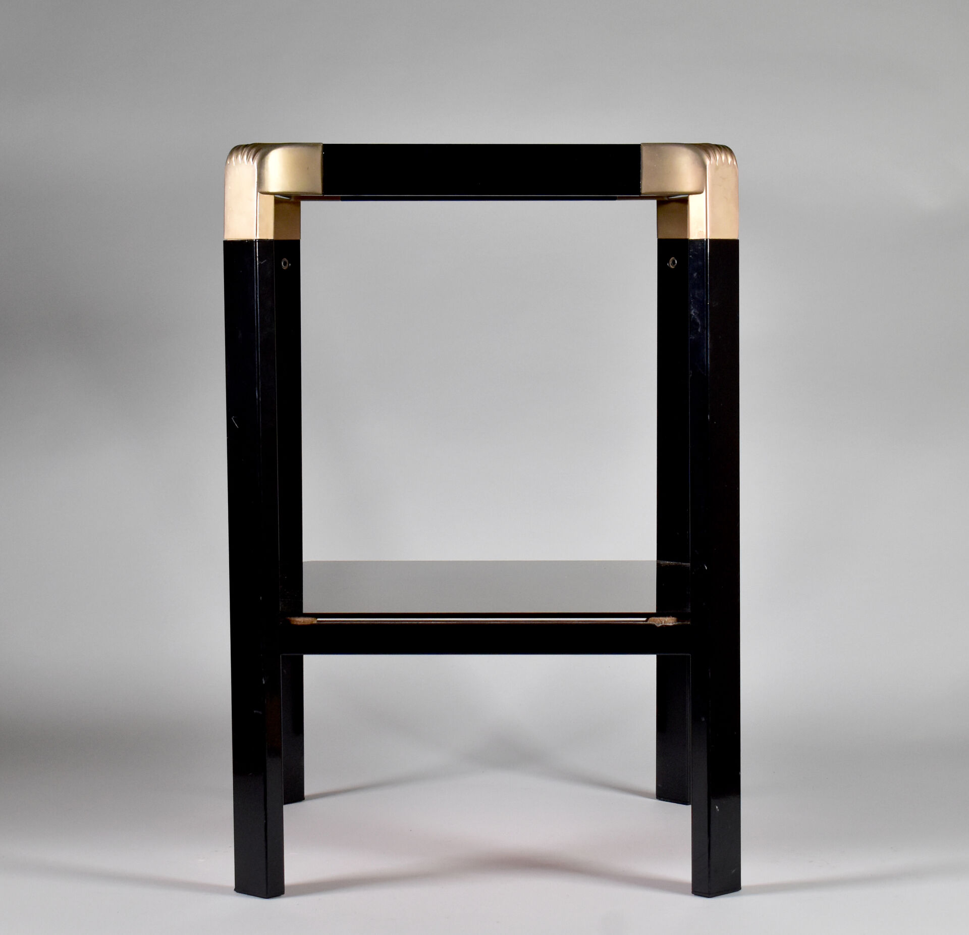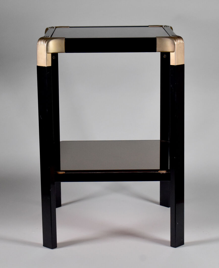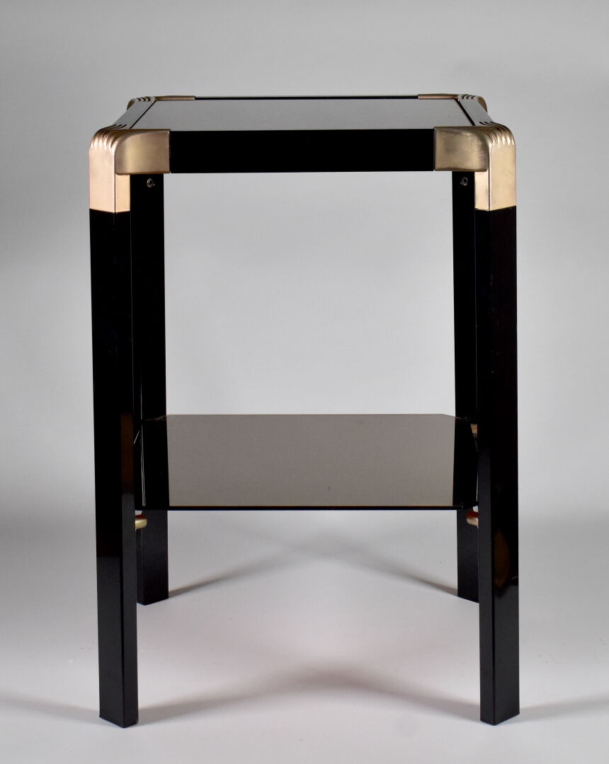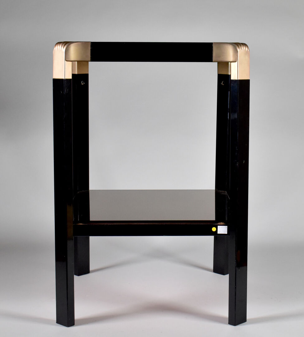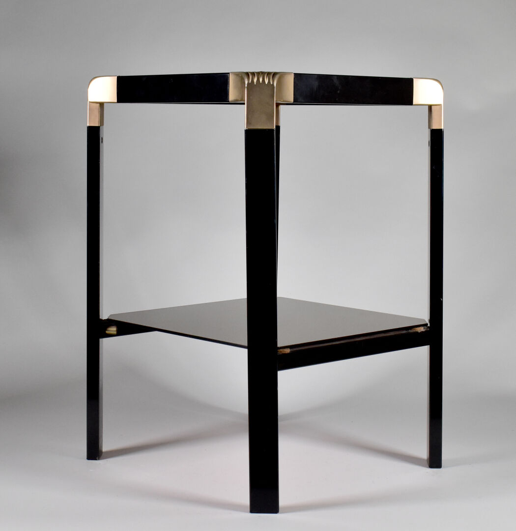 Bout de canapé en métal laqué brun et or dans les angles. Double plateau de verre, celui du bas à fond de glace. Vers 1980. Haut. : 59,5 cm – Larg. : 41 cm – Prof. : 41 cm.