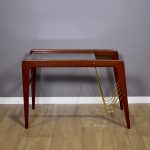 Bout de canapé en teck teinté et laiton à un plateau de verre (quelques usures). Travail scandinave, vers 1950. Haut. : 51 cm – Larg. 70 cm – Prof. : 40,5 cm.