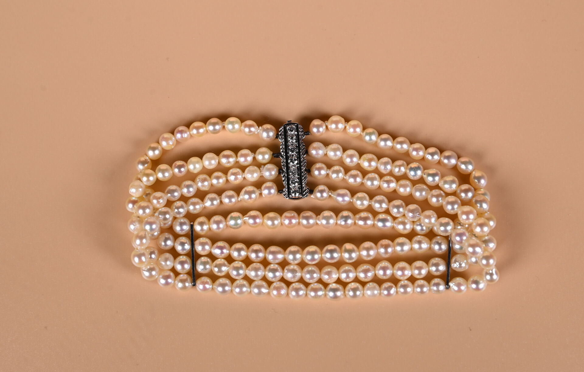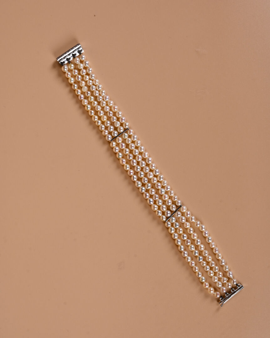 Bracelet de quatre rangs de perles de culture. Fermoir baguette en or gris 750 millièmes (18k) serti de diamants probablement synthétiques. Longueur : 19,5 cm. Poids brut : 22,5 g