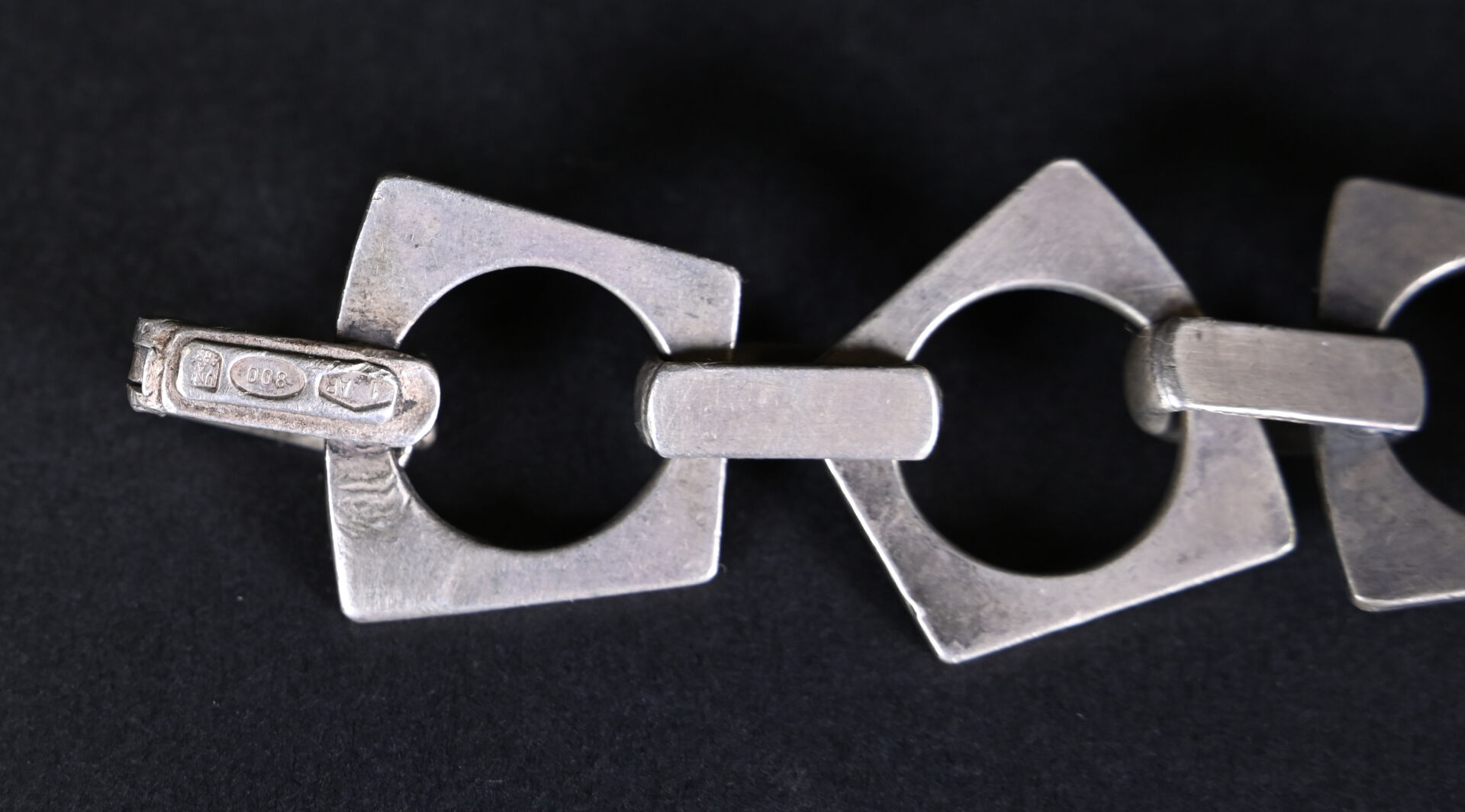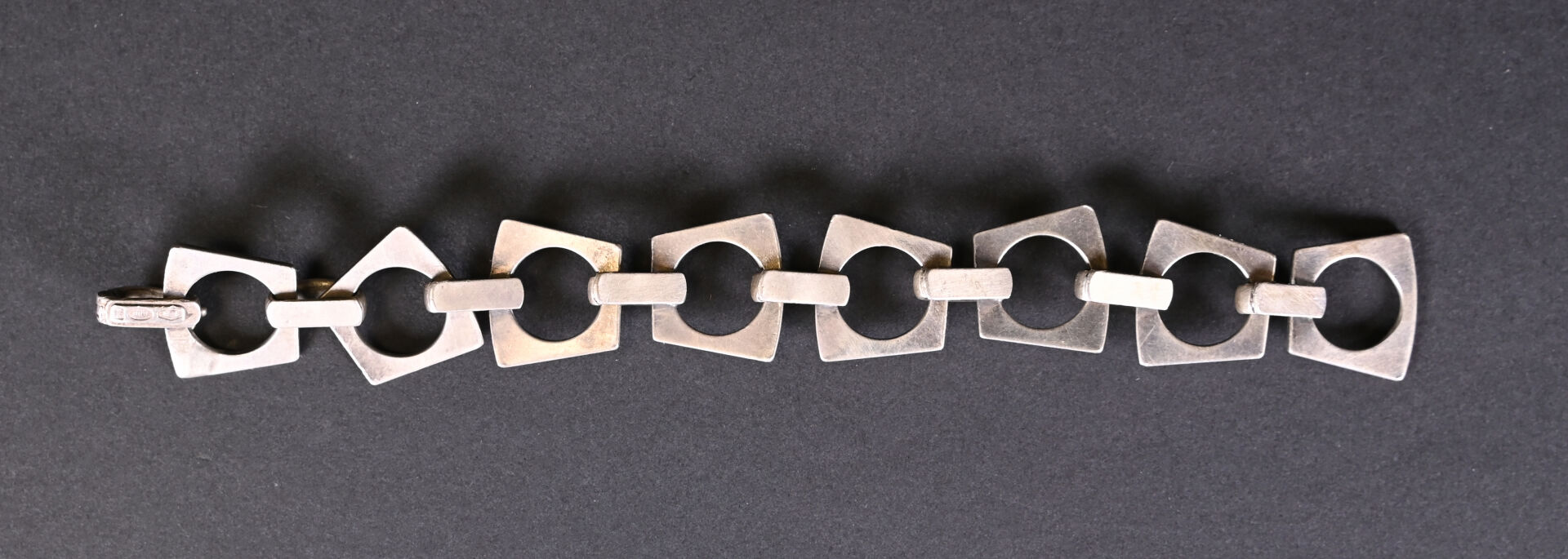 Bracelet en argent 800/1000 à maillons géométriques articulés. Longueur : 19 cm. Poids : 43,9 g