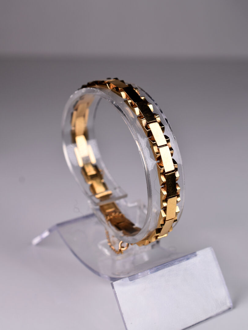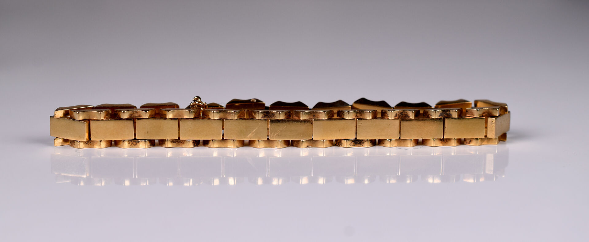 Bracelet en or 18K 750/1000e à mailles articulées en rectangle et petits ponts avec chaine de sécurité. Long. fermé. : 16 cm. Poids : 14,2 g.