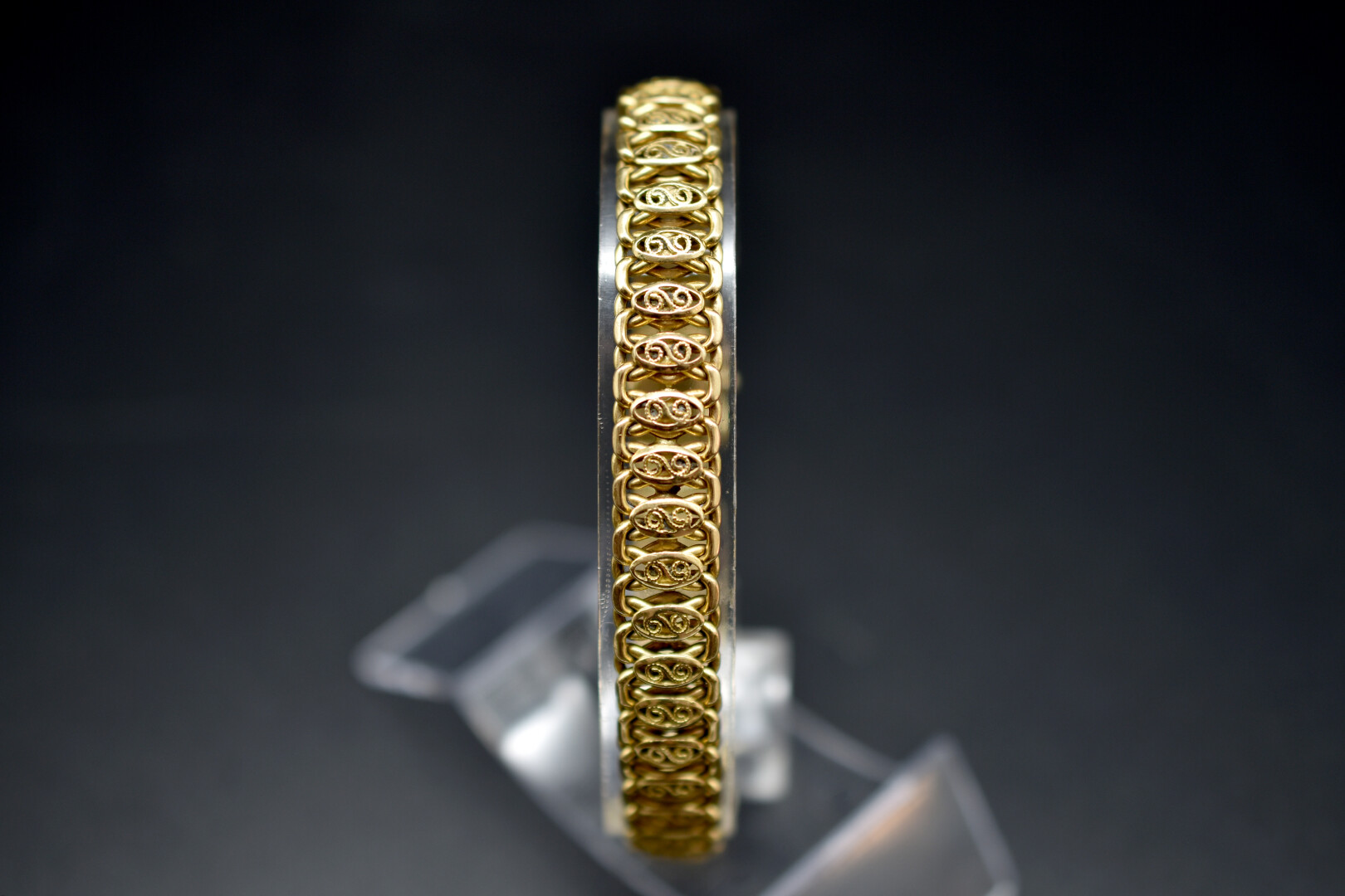 Bracelet en or jaune 18K 750/1000e à maille souple filigrannée ajourée. Poids : 22,60 g.