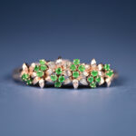 Bracelet en partie rigide en or gris 750/1000 à motifs floraux d’émeraudes rondes. Travail de ciselure sur la maille. Étranger. Longueur : 17 cm. Poids brut : 31,9 g.