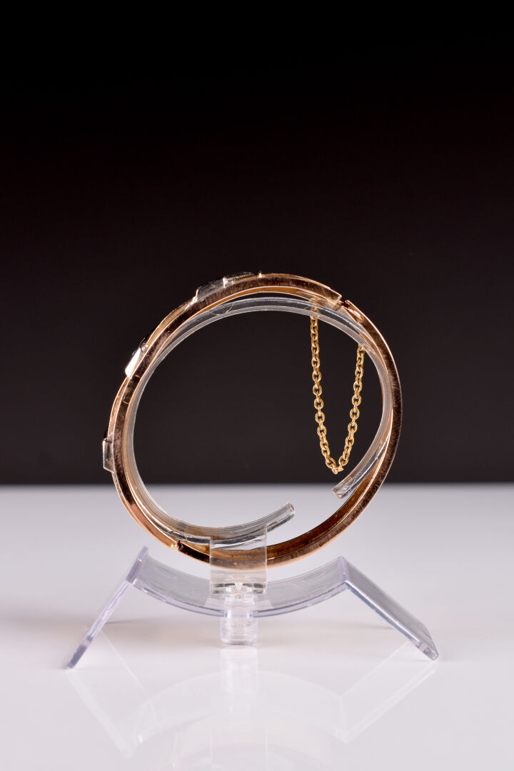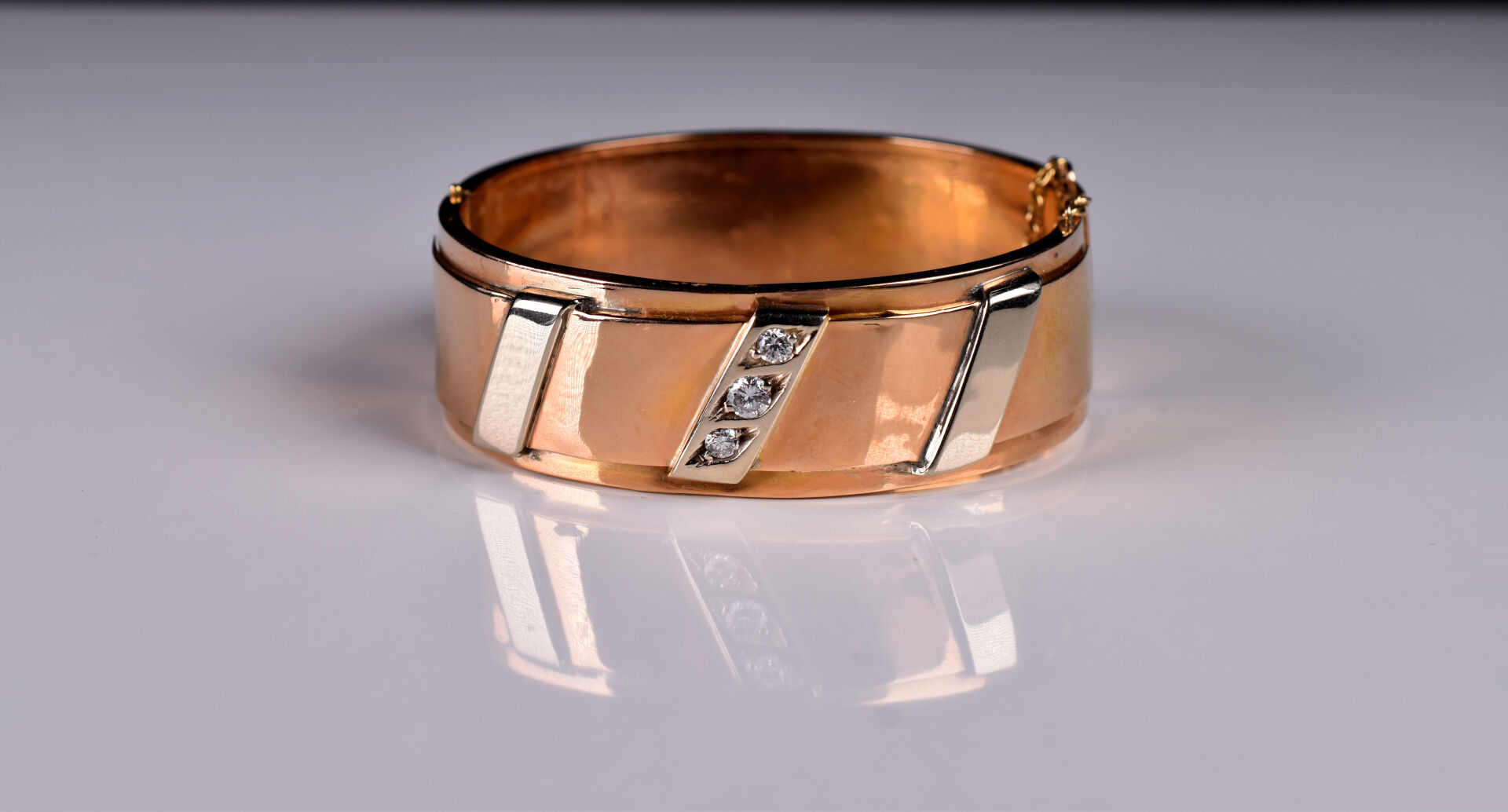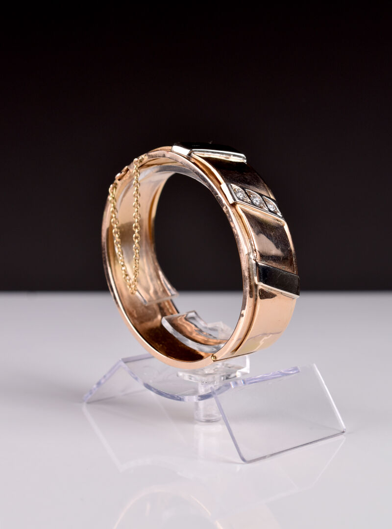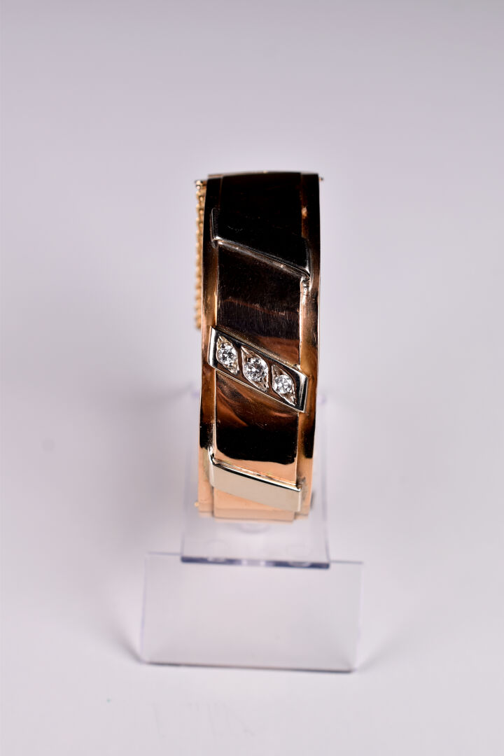 Bracelet jonc en or jaune 18K 750/1000e à décor de rubans. Le central présentant trois diamants de taille moderne d’environ 0,18 carat pour le plus important (petites déformations). Poids brut. : 26,80 g.