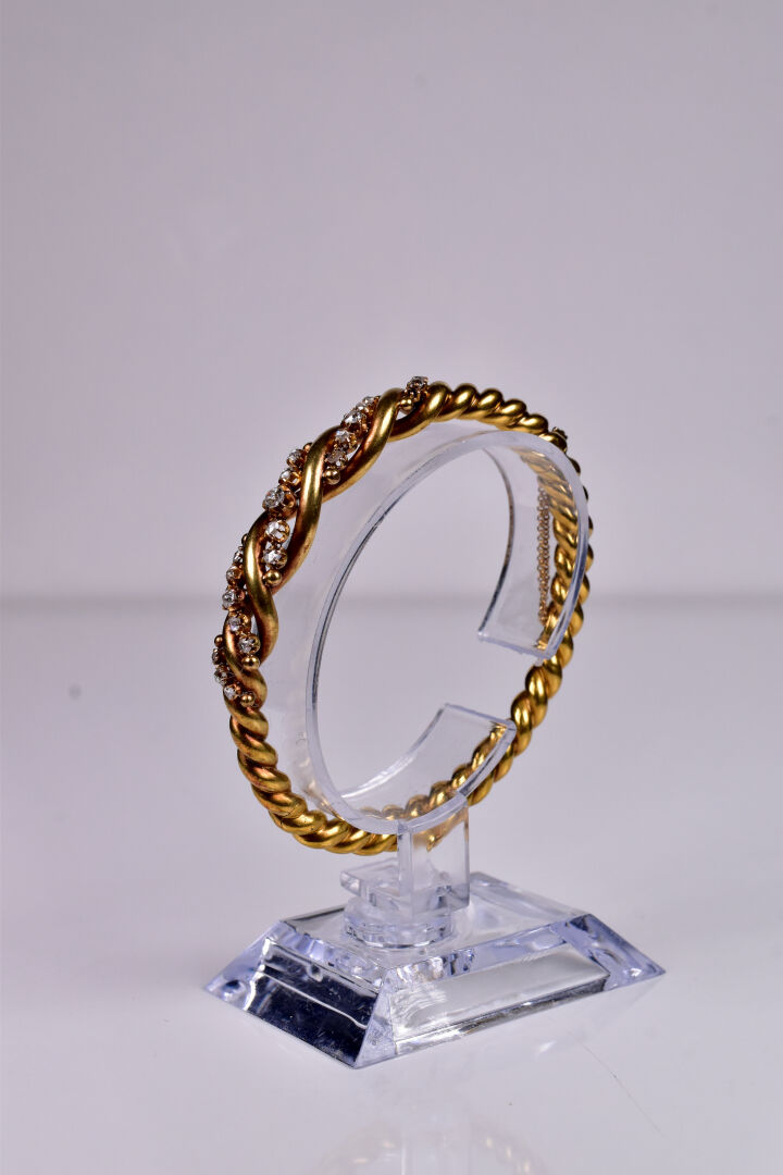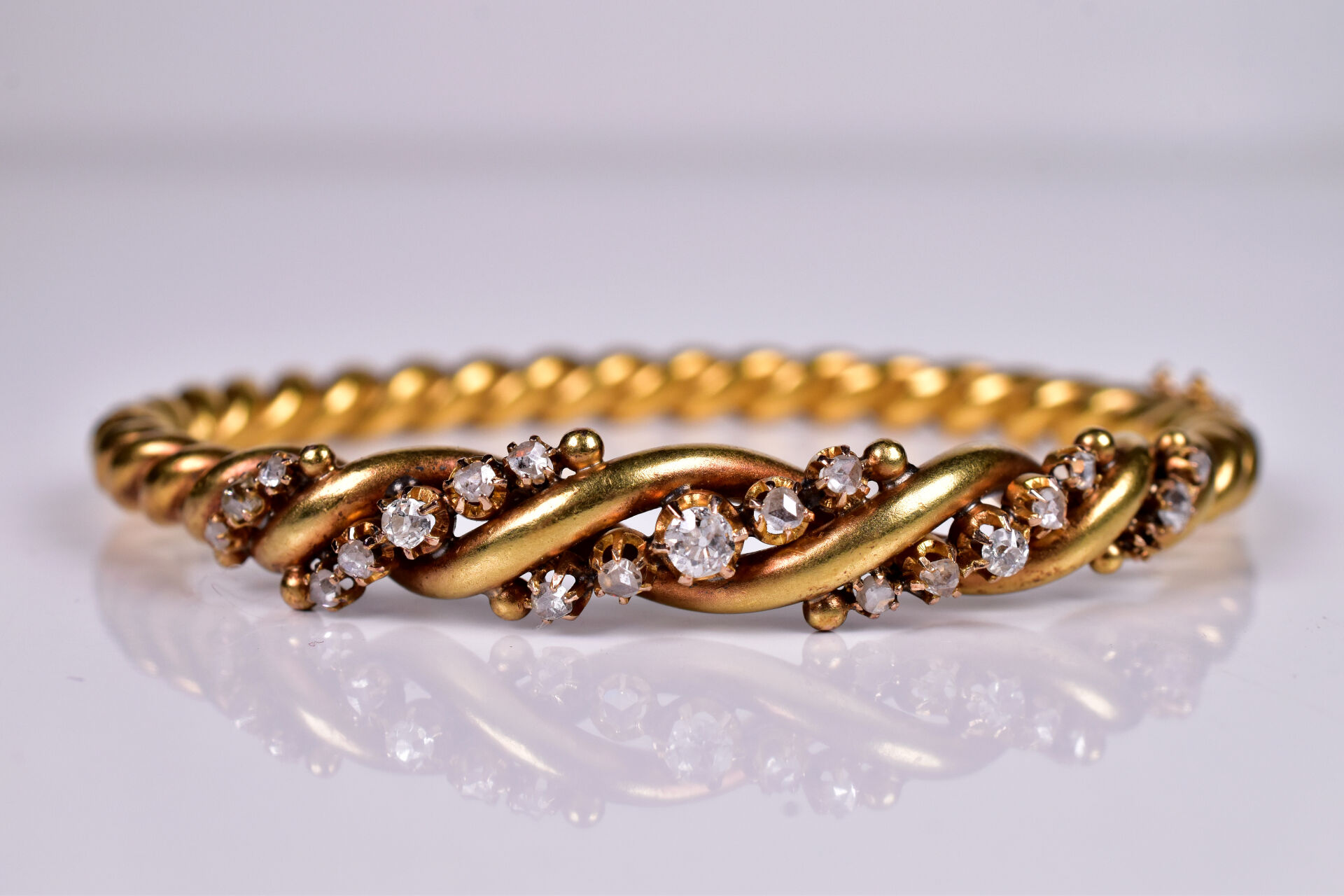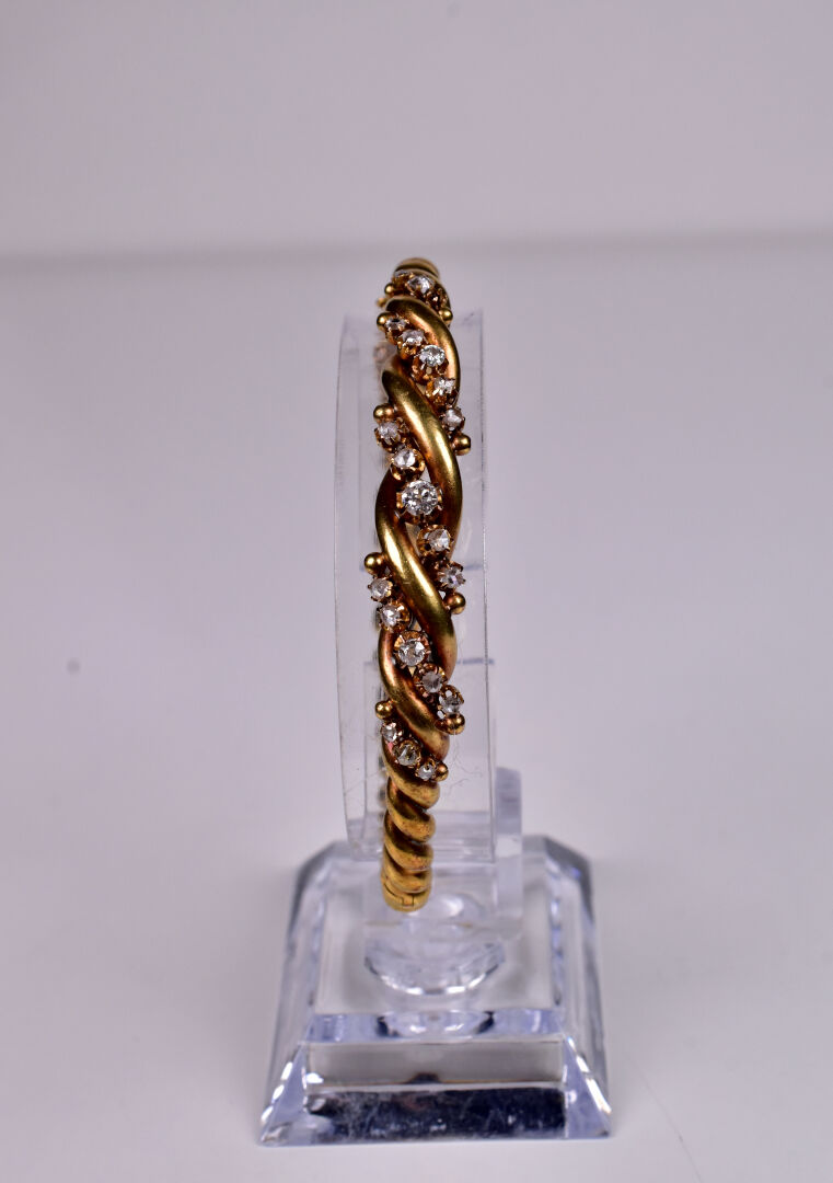 Bracelet jonc ouvrant en or jaune 750/1000e à maille rigide torsadée, serti sur le dessus de 5 lignes de diamants taille ancienne et de 5 lignes de diamants taille brillant. Numéroté au niveau du fermoir. Diam. : 5,7 cm. Poids brut. : 17,3 g.