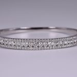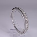 Bracelet jonc rigide ouvrant en or 14K 585/1000e serti sur le dessus d’une ligne de 25 diamants taille moderne de 0,10 carat chacun env. Epaulés de deux lignes de petits diamants en pavage. 6 x 5 cm. Poids brut. : 22,85 g.