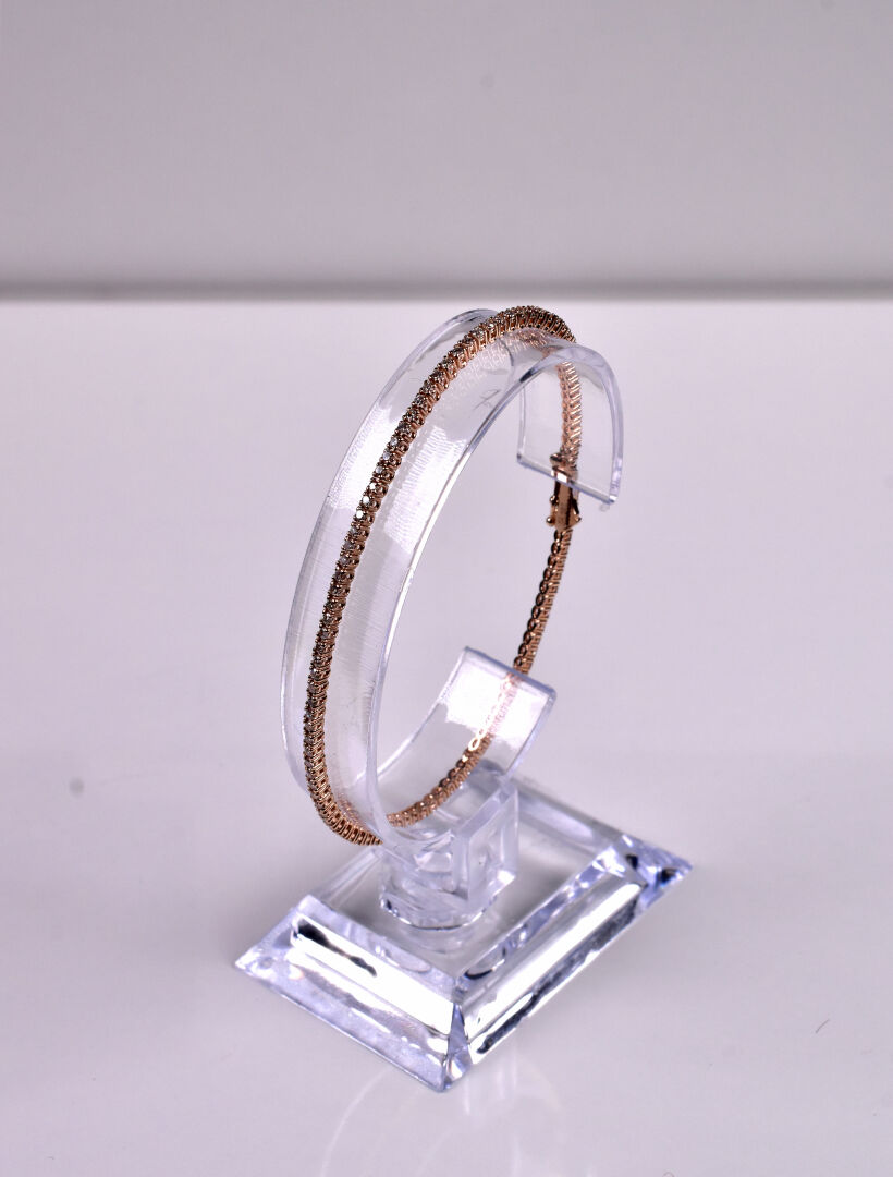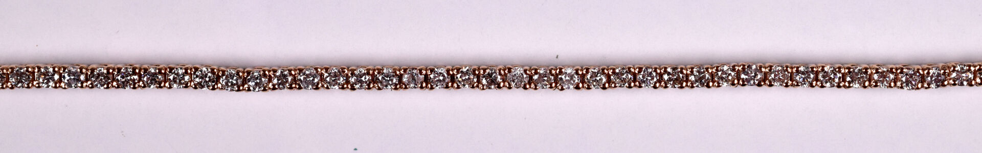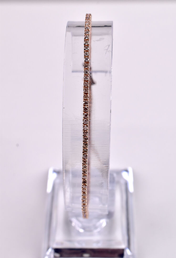 Bracelet ligne en or rose 14K 585/1000e, orné de 100 diamants taille moderne de 0,01 carat environ. Long. : 18 cm. Poids brut. : 5,2 g. Ecrin. Accompagné de son certificat AIG (7 décembre 2023, précisant selon leur opinion couleur : light pink, pureté : VS1 à SI3.