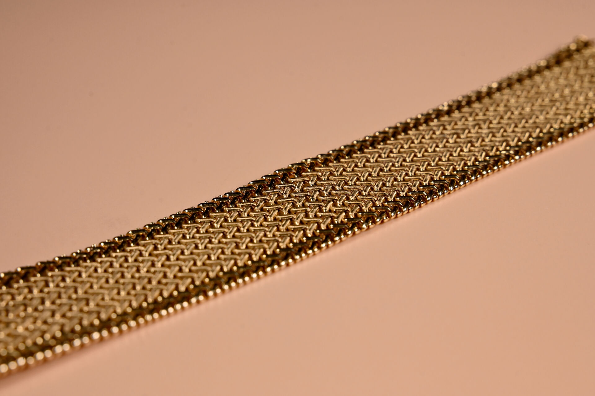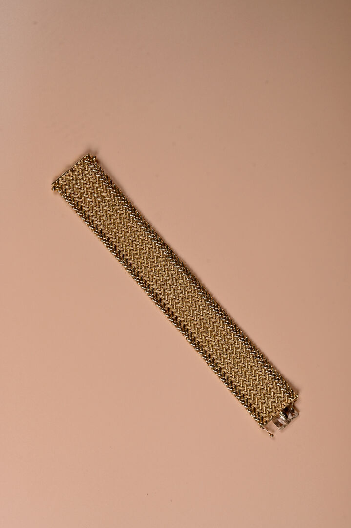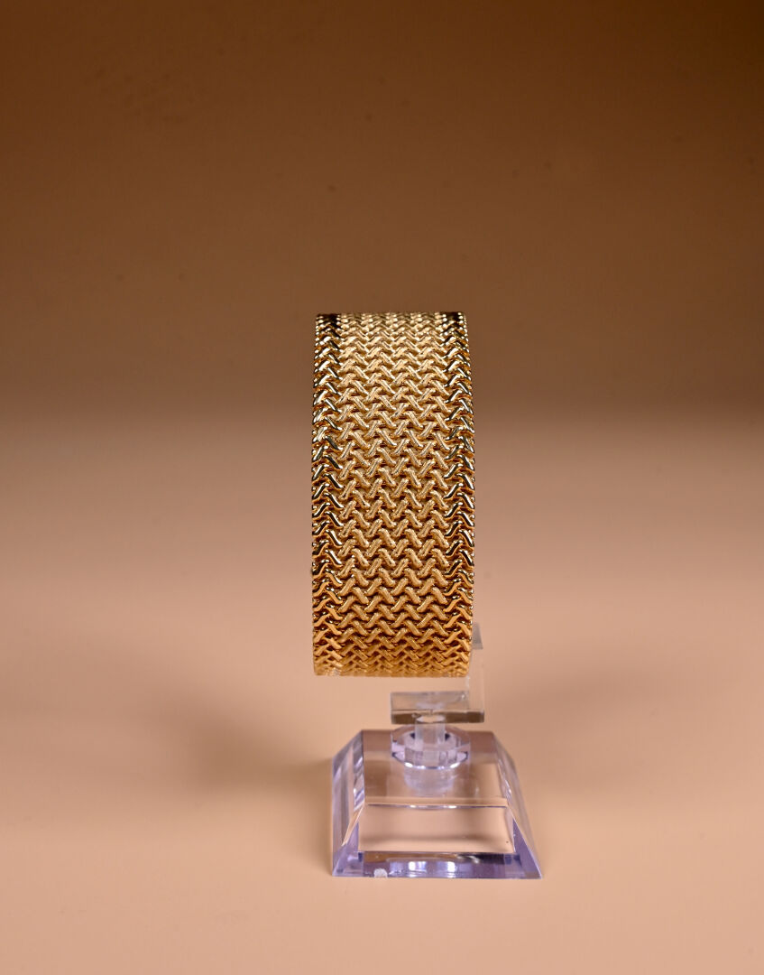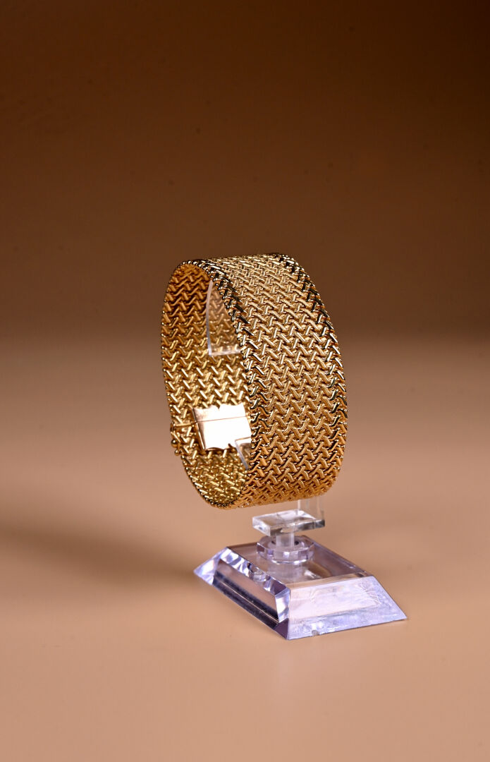 Bracelet manchette souple en or jaune 18k 750/1000e à maille tressée. Long. : 19 cm -Llarg. : 3 cm. Travail français. Poids. : 80,9 g.