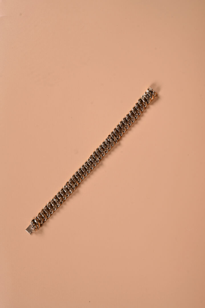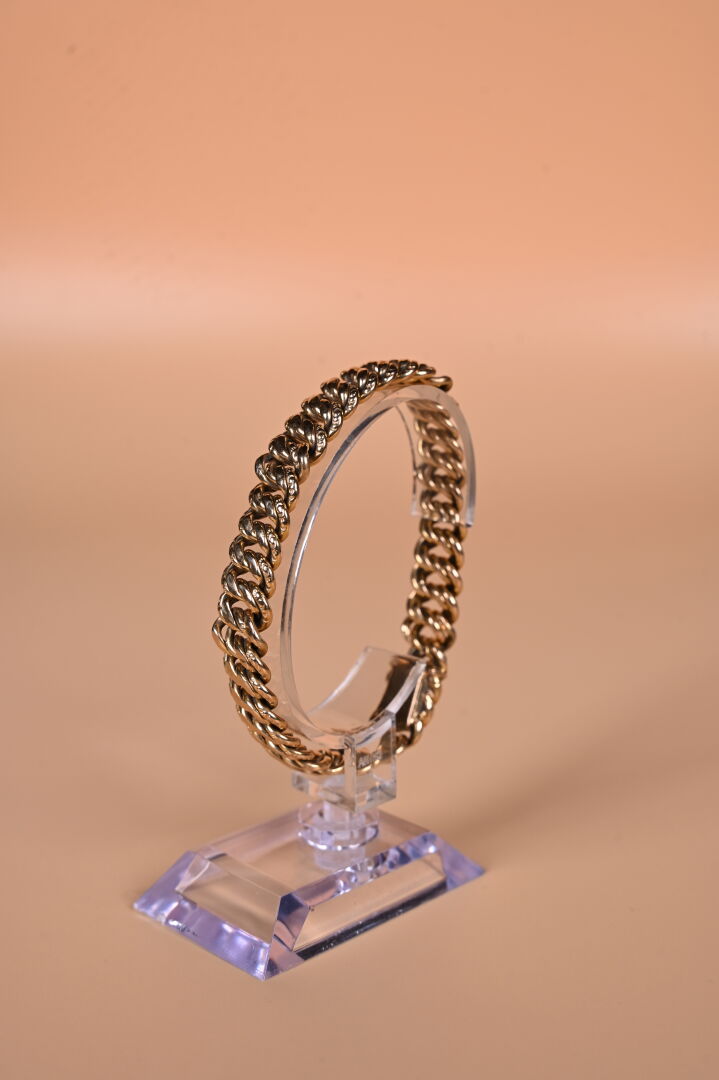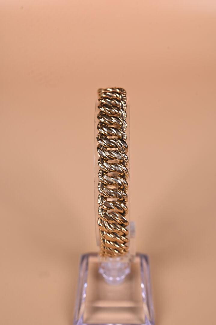 Bracelet souple à maille américaine en partie ciselée en or jaune 18K 750/1000e (petits chocs, usures). Long. : 21 cm. Poids. : 23,02 g.