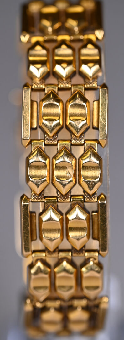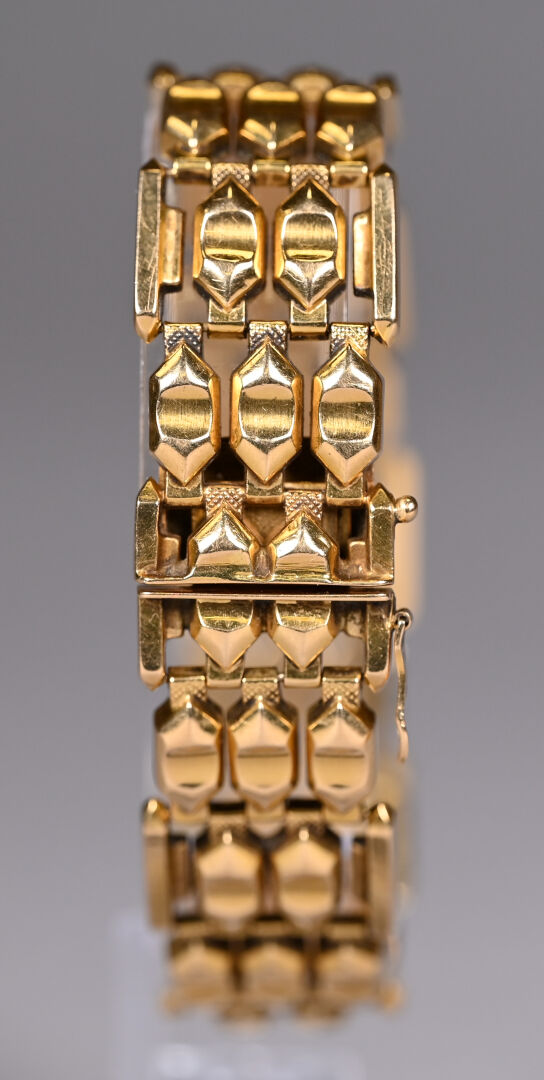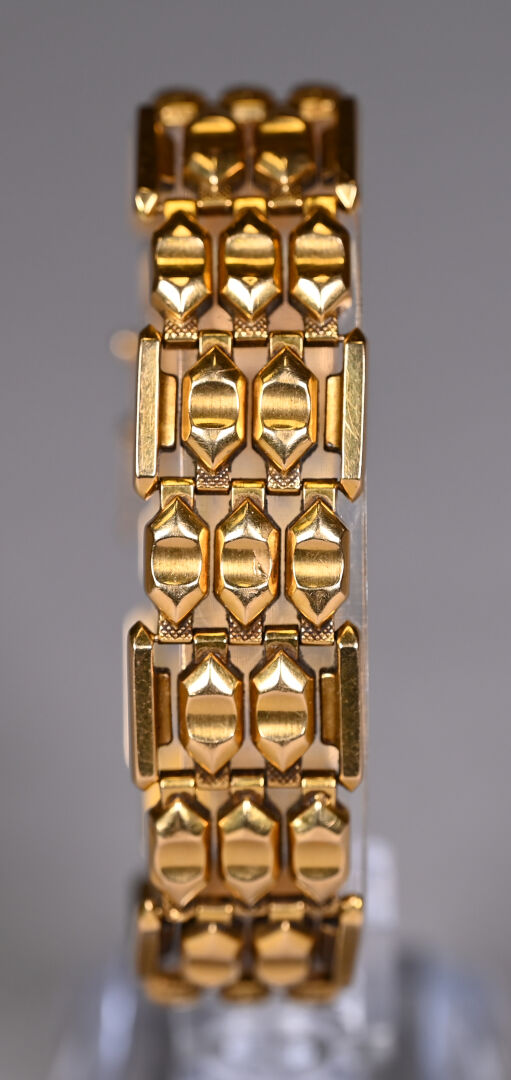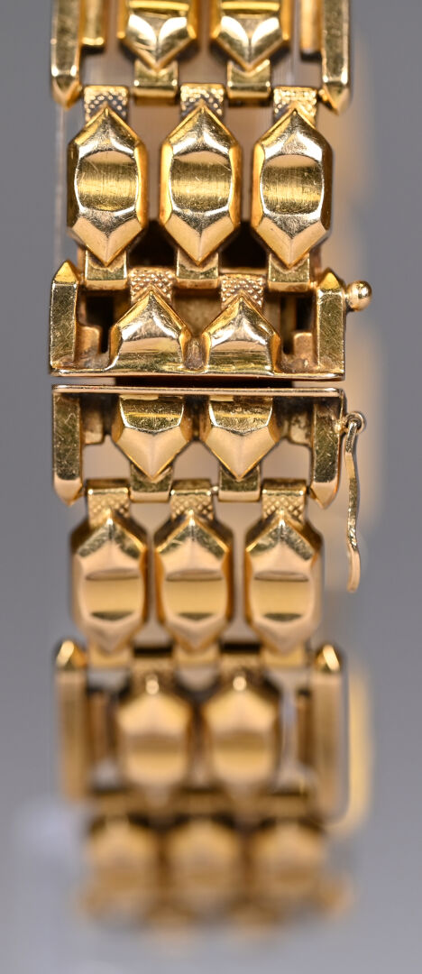 Bracelet souple en or 18k 750/1000e à maille articulée. Longueur : 19 cm. Largeur : 2 cm. Poids : 27,6 g.