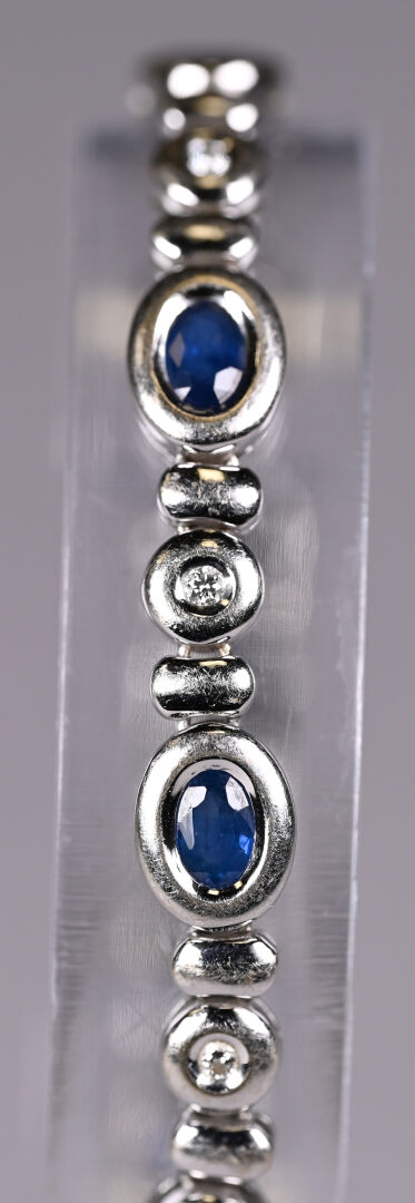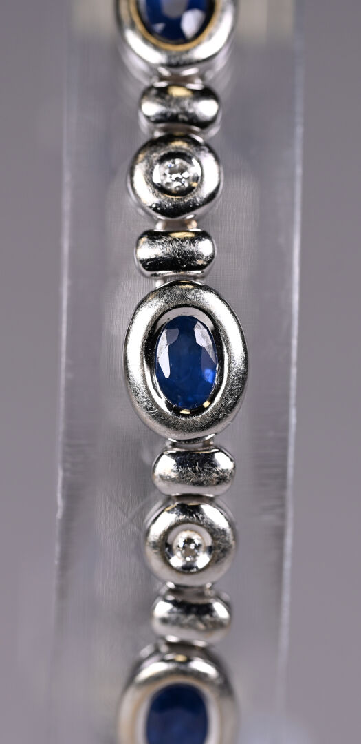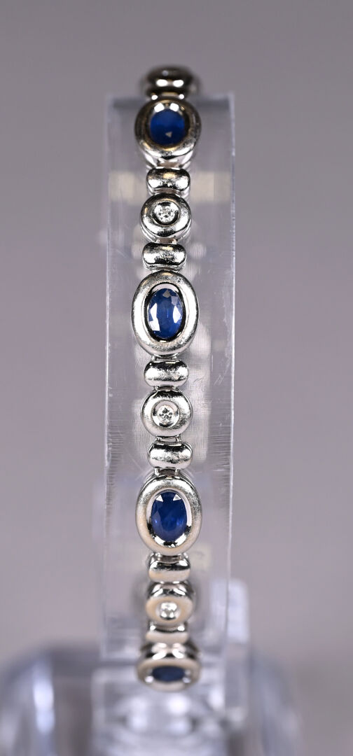 Bracelet souple en or gris 18k 750/1000e orné de 8 saphirs ovales d’env. 0,40 ct chacun (serti ovale clos) alternés de 8 petits diamants. Longueur : 18 cm. Poids brut : 19,4 g.