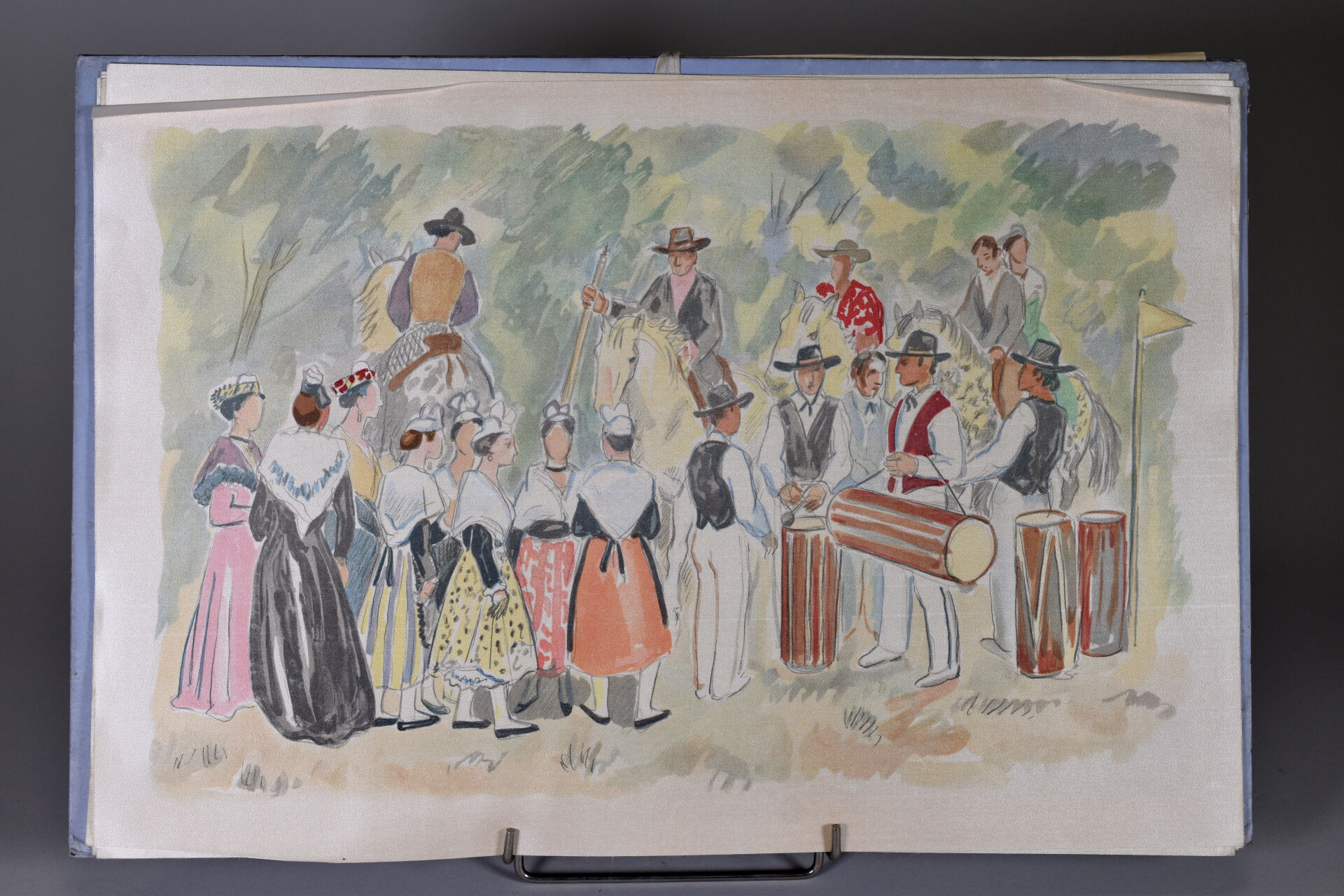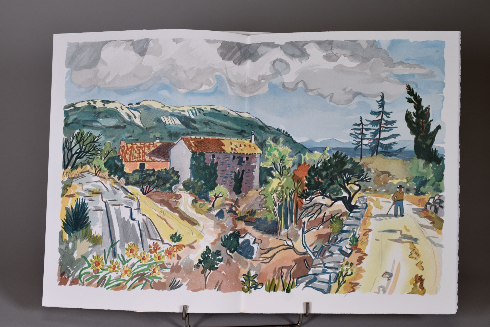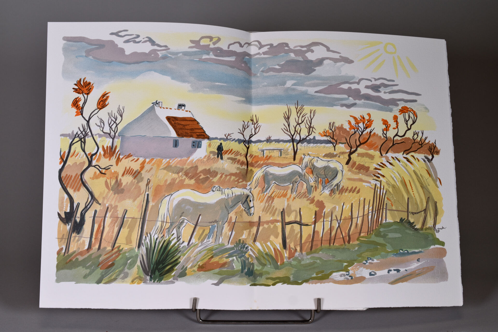 [BRAYER]. MISTRAL (Fr.). PROVENCE. Paris, Pierre de Tartas, 1983. Petit in-folio en feuilles sous couverture à rabats illustrée en couleurs, boîte-écrin de l’éditeur + chemise cartonnée in-folio à l’italienne (défraîchie). ÉDITION ILLUSTRÉE de dessins originaux d’Yves BRAYER. Tirage limité à 530 exemplaires. UN des 70 numérotés sur grand vélin d’ARCHES comportant à part sous chemise une SUITE tirée sur soie de 6/8 doubles-planches en couleurs dont 2 sont signées par l’artiste [MANQUE 2 planches signées) et à laquelle est joint un tirage sur Japon Impérial des 14 dessins supplémentaires reproduits en 7 PLANCHES sur Japon fin. ENVOI AUTOGRAPHE signé de l’artiste avec un DESSIN ORIGINAL au feutre vermillon. JOINT : GIONO (J.). YVES BRAYER. P., Bibliothèque des Arts, 1971. Petit in-folio toile éditeur SANS la jaquette papier couleurs. SECONDE ÉDITION revue et augmentée.
