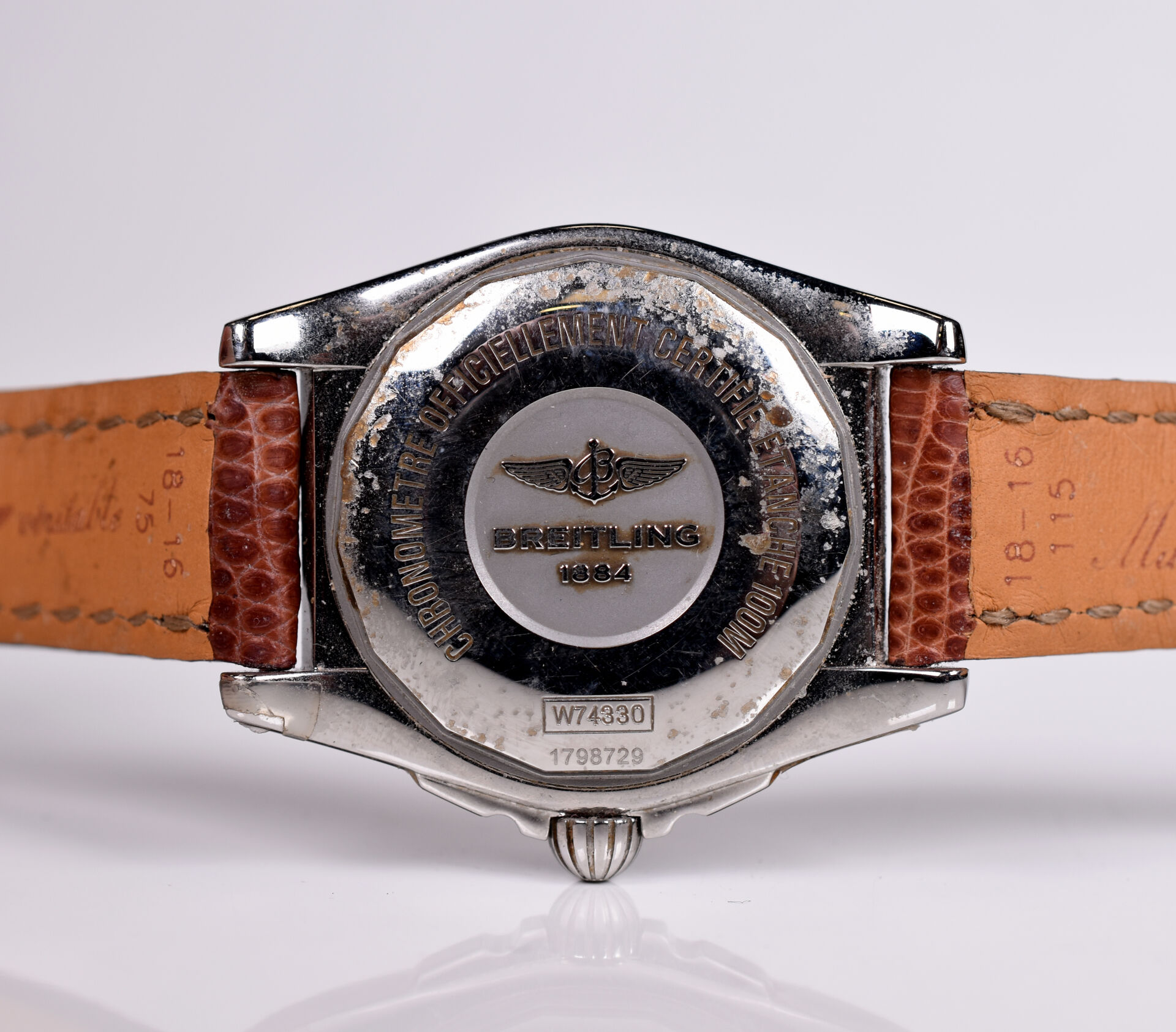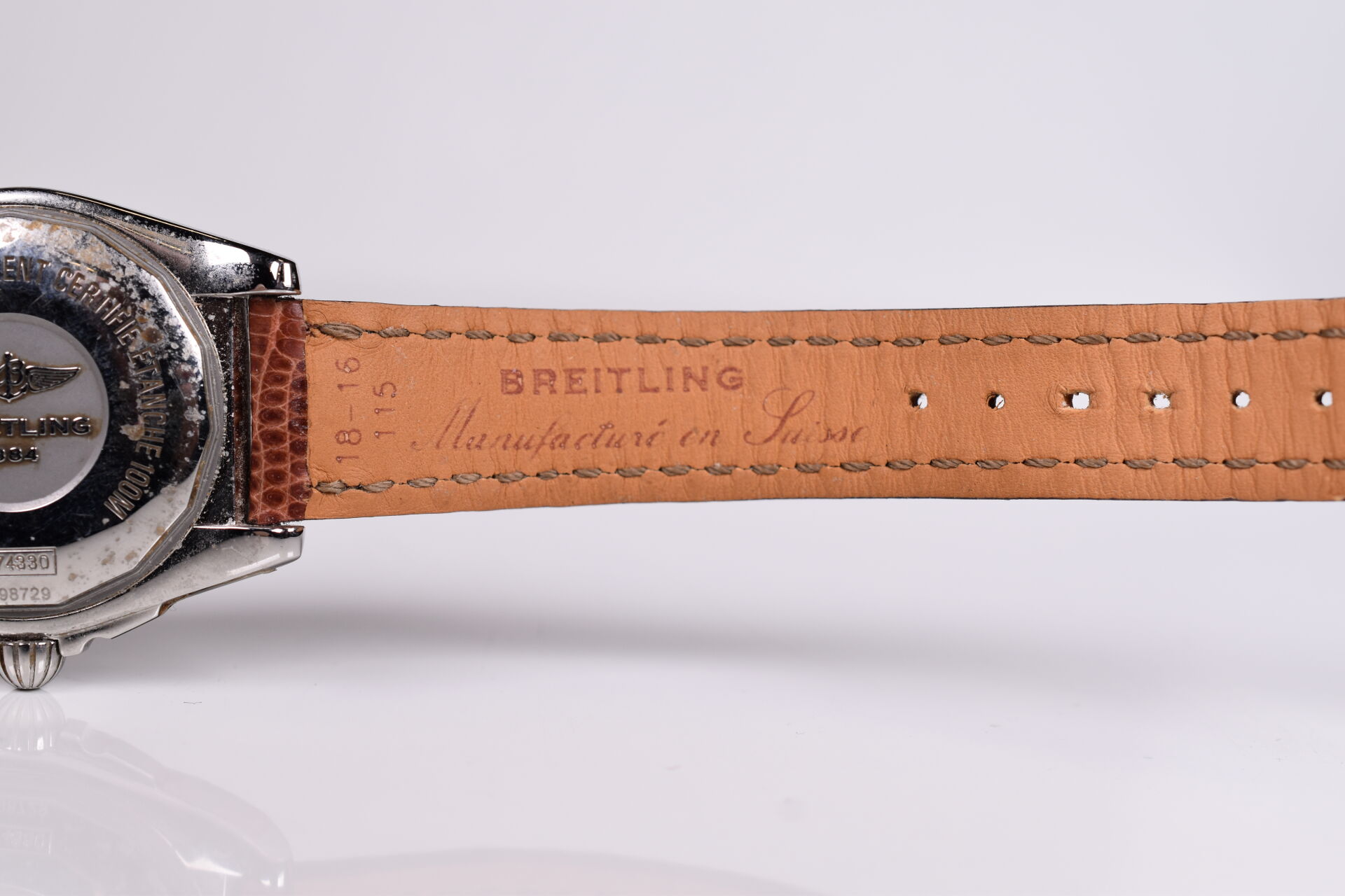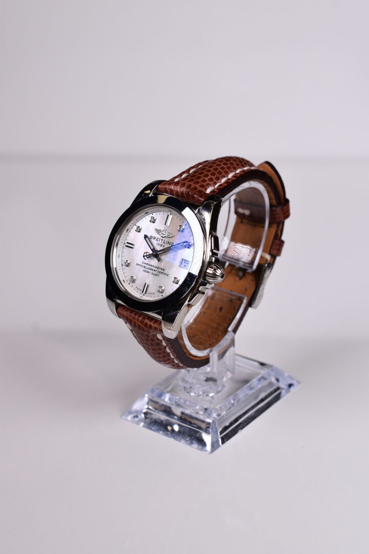 BREITLING. Modèle « Galactic », montre de dame. Boitier en acier (35 mm), cadran nacre, index des heures bâton et brillants et guichet dateur à 3h. Mouvement quartz (fonctionne). Bracelet d’origine en cuir marron.