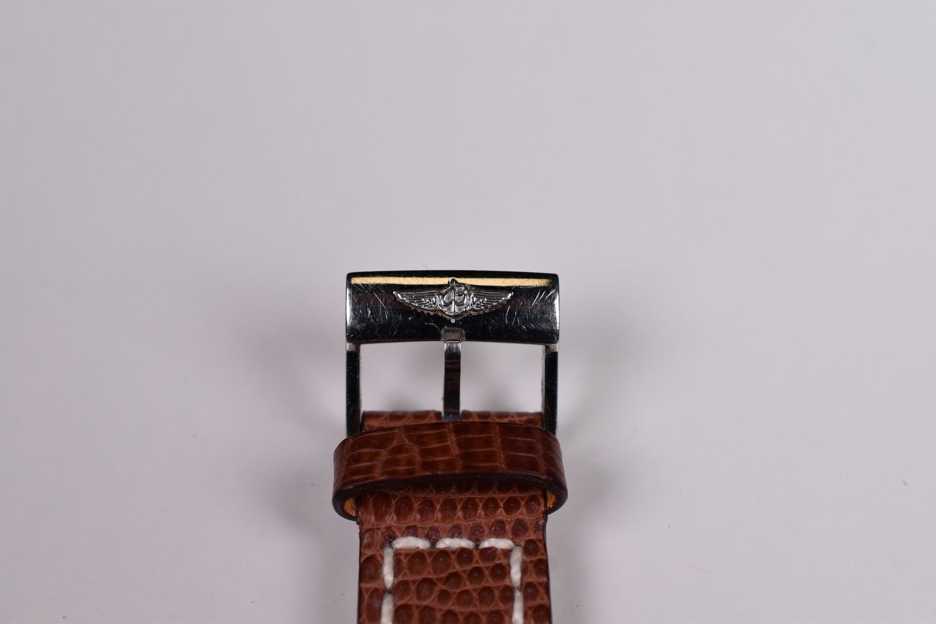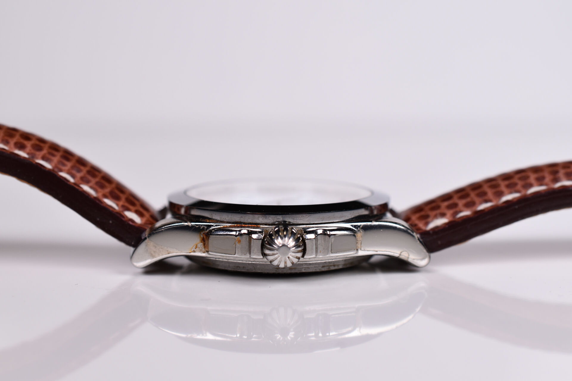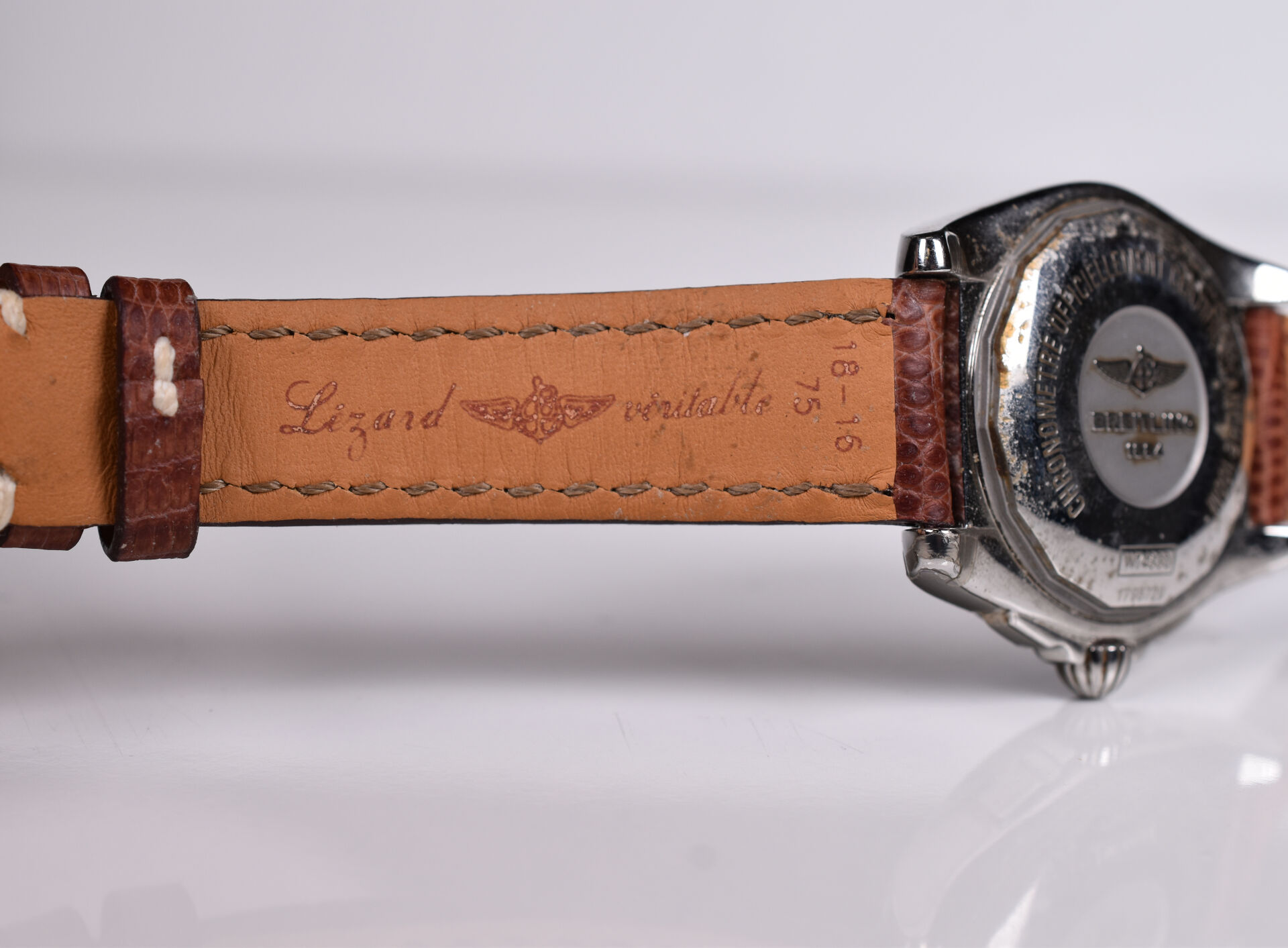 BREITLING. Modèle « Galactic », montre de dame. Boitier en acier (35 mm), cadran nacre, index des heures bâton et brillants et guichet dateur à 3h. Mouvement quartz (fonctionne). Bracelet d’origine en cuir marron.