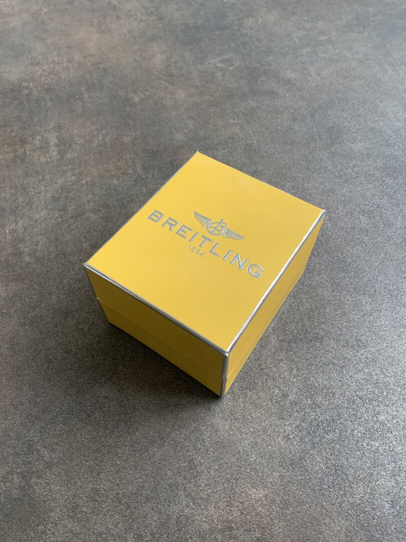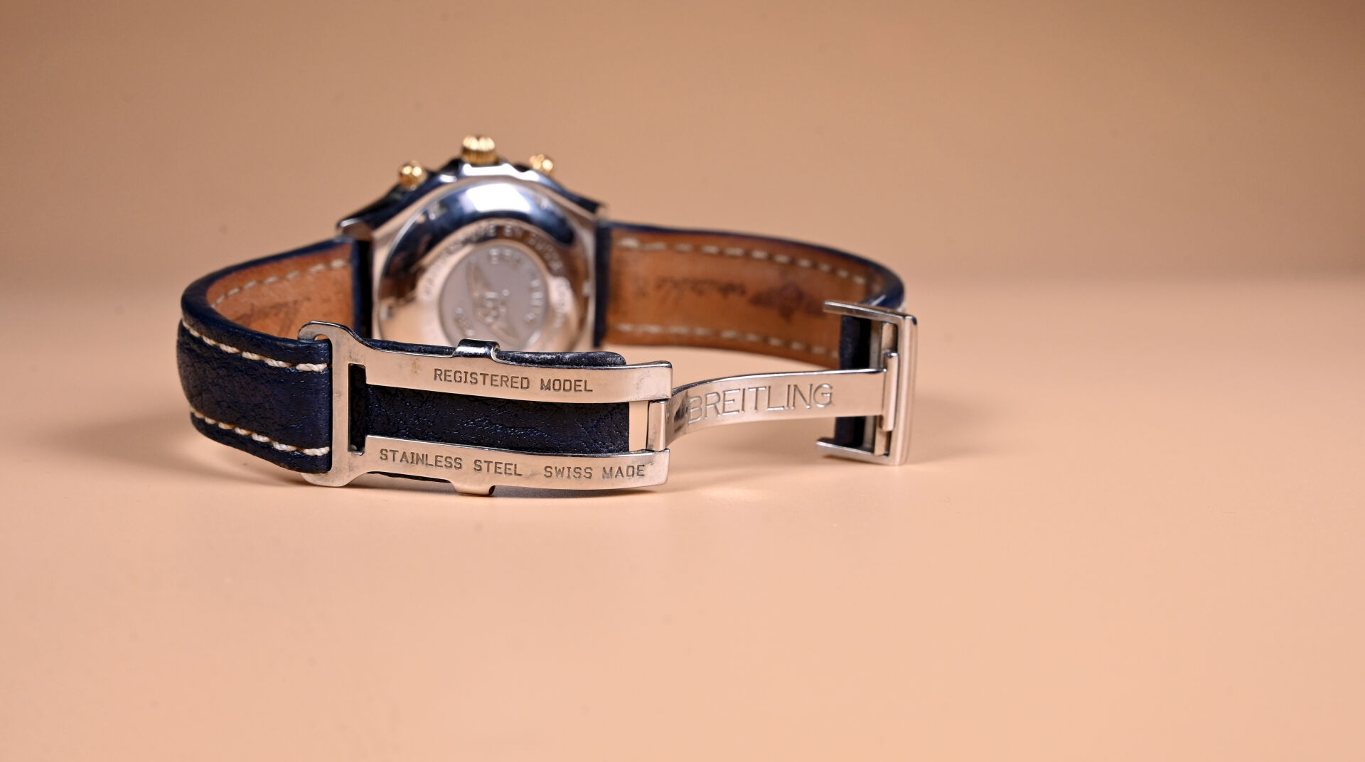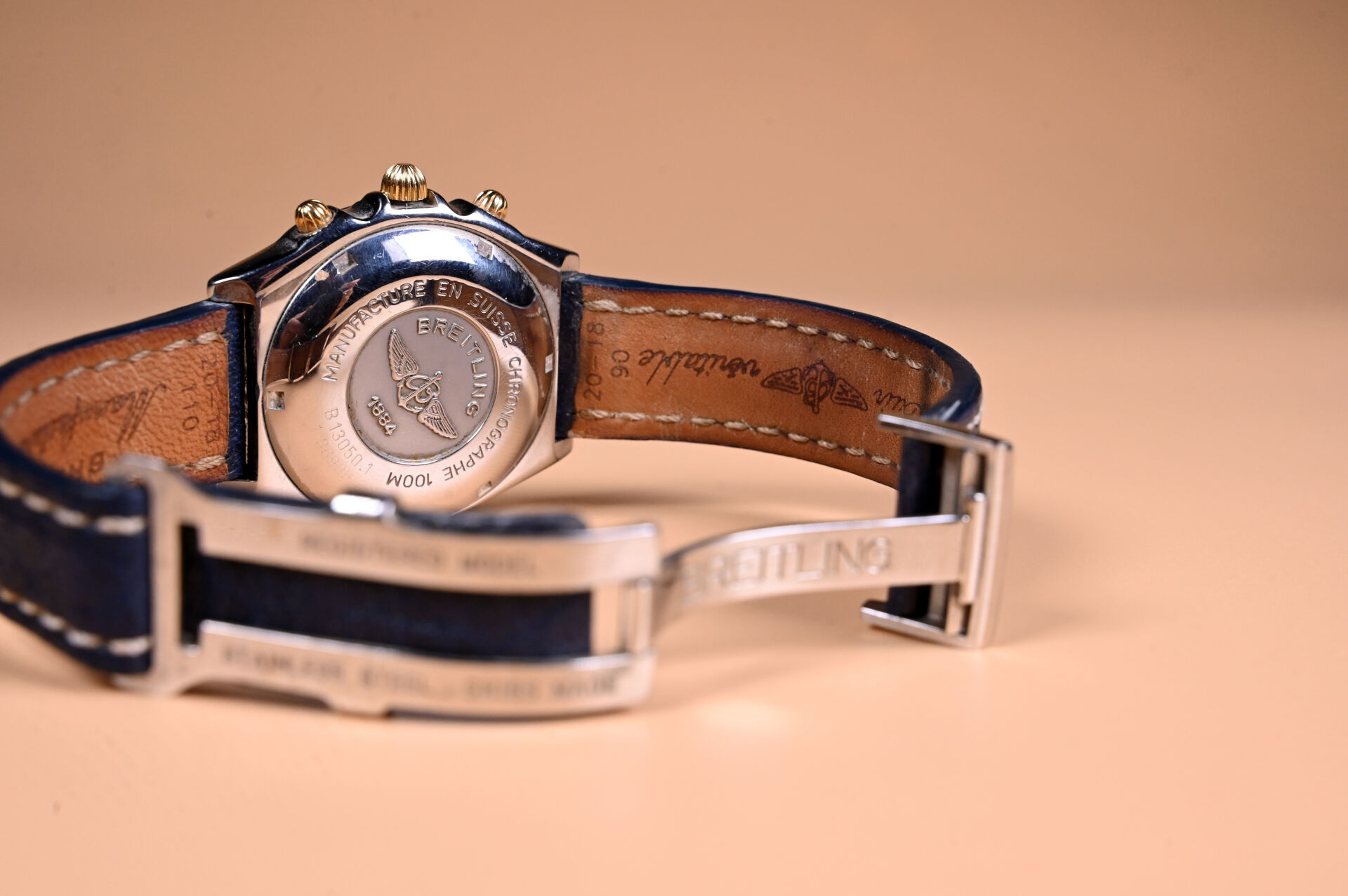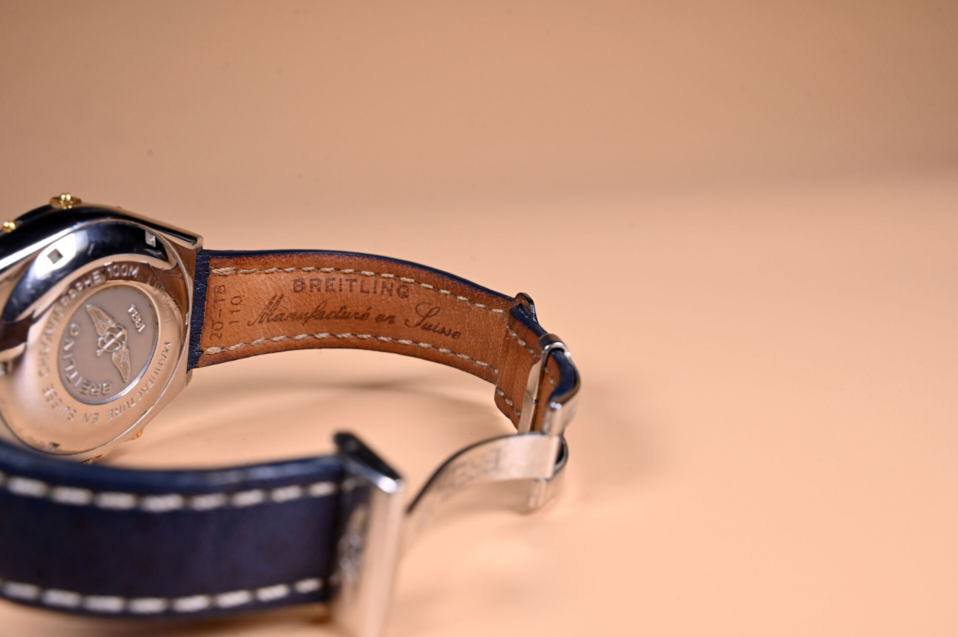 BREITLING. Montre bracelet à boitier rond en acier et acier doré, cadran à fonds bleu avec 3 compteurs et guichet dateur à 3H. Mouvement mécanique à remontage automatique. Bracelet d’origine en cuir bleu sur boucle déployante signée. Fonctionne à réviser. Diam. : 38 mm. Avec boîte.