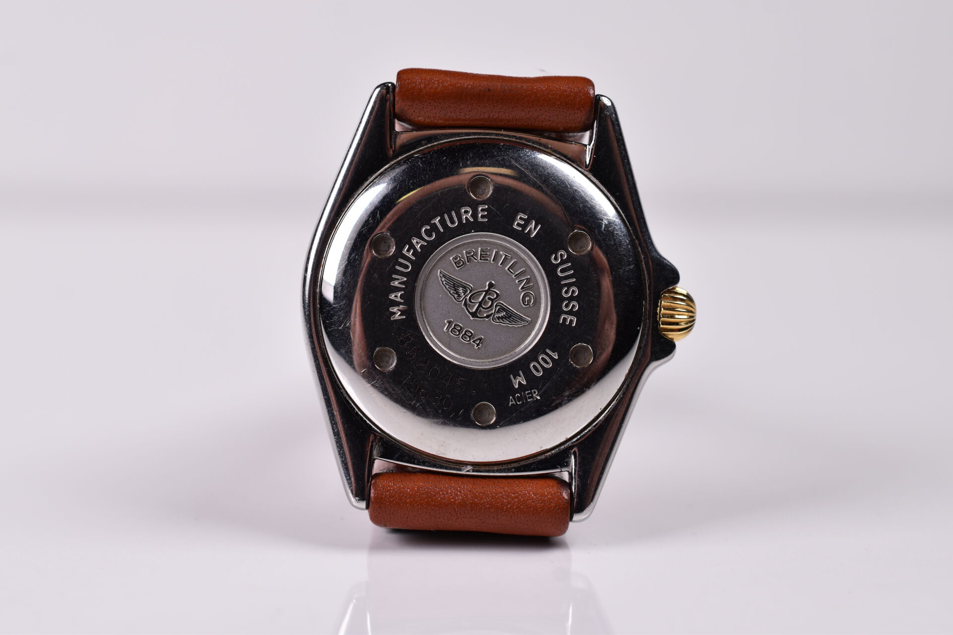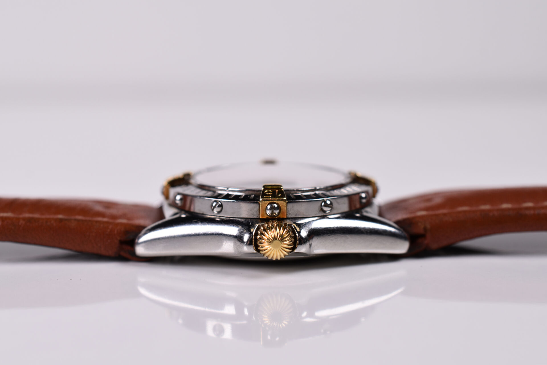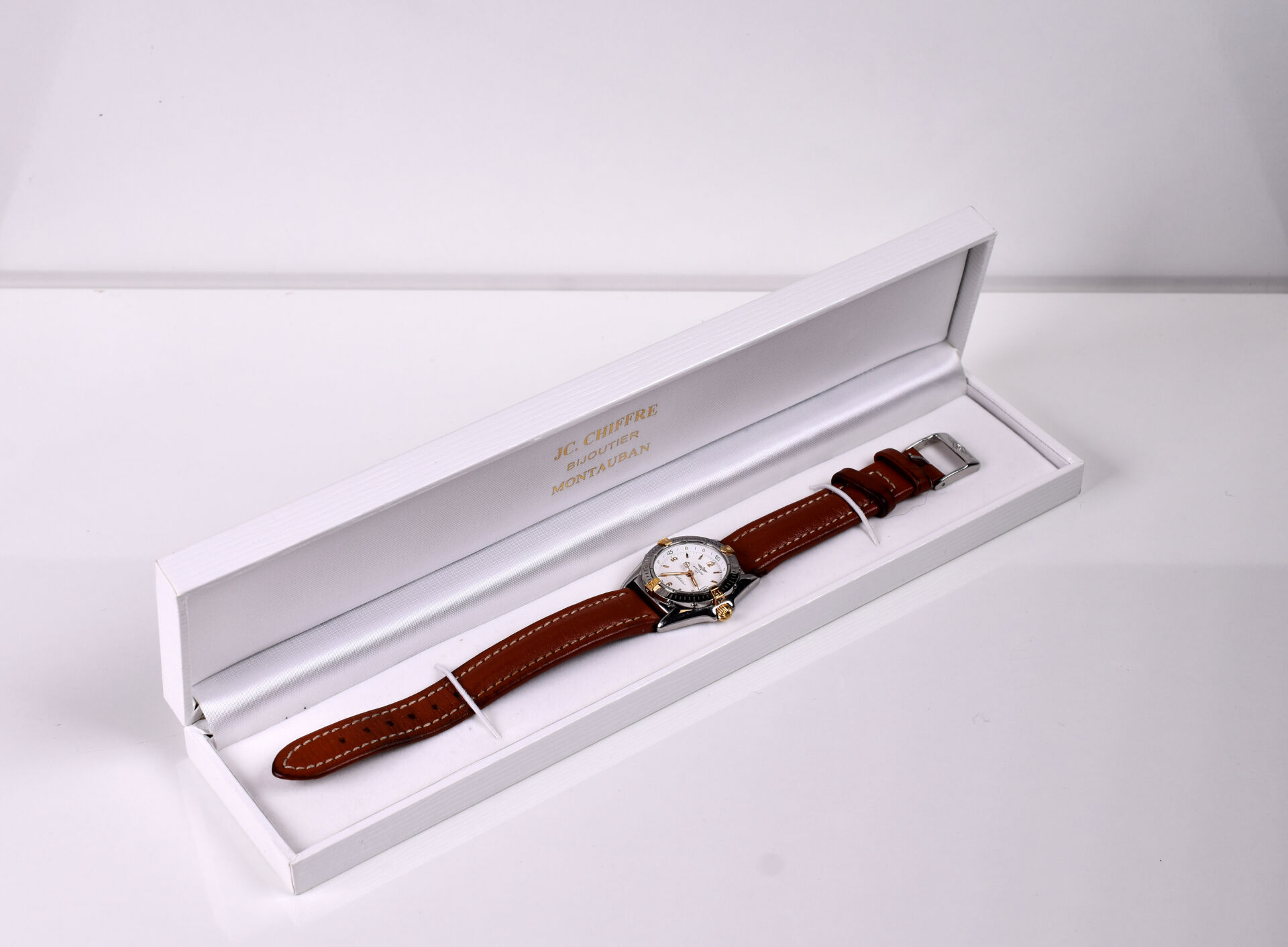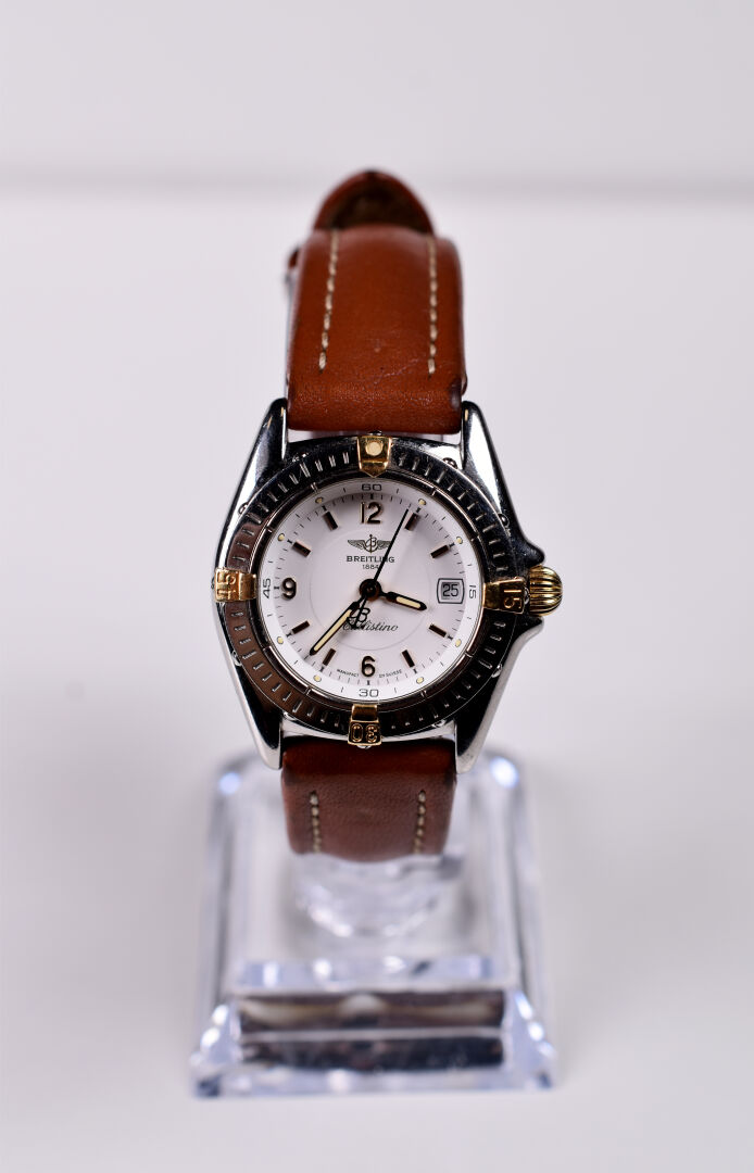 BREITLING. Montre bracelet de dame modèle Callistino à boitier en acier, cadran blanc, index batons formant les heures, guichet date à 3h. Mouvement à quartz (démarre). Bracelet cuir fauve (usures) avec sa boucle ardillon en acier signée.