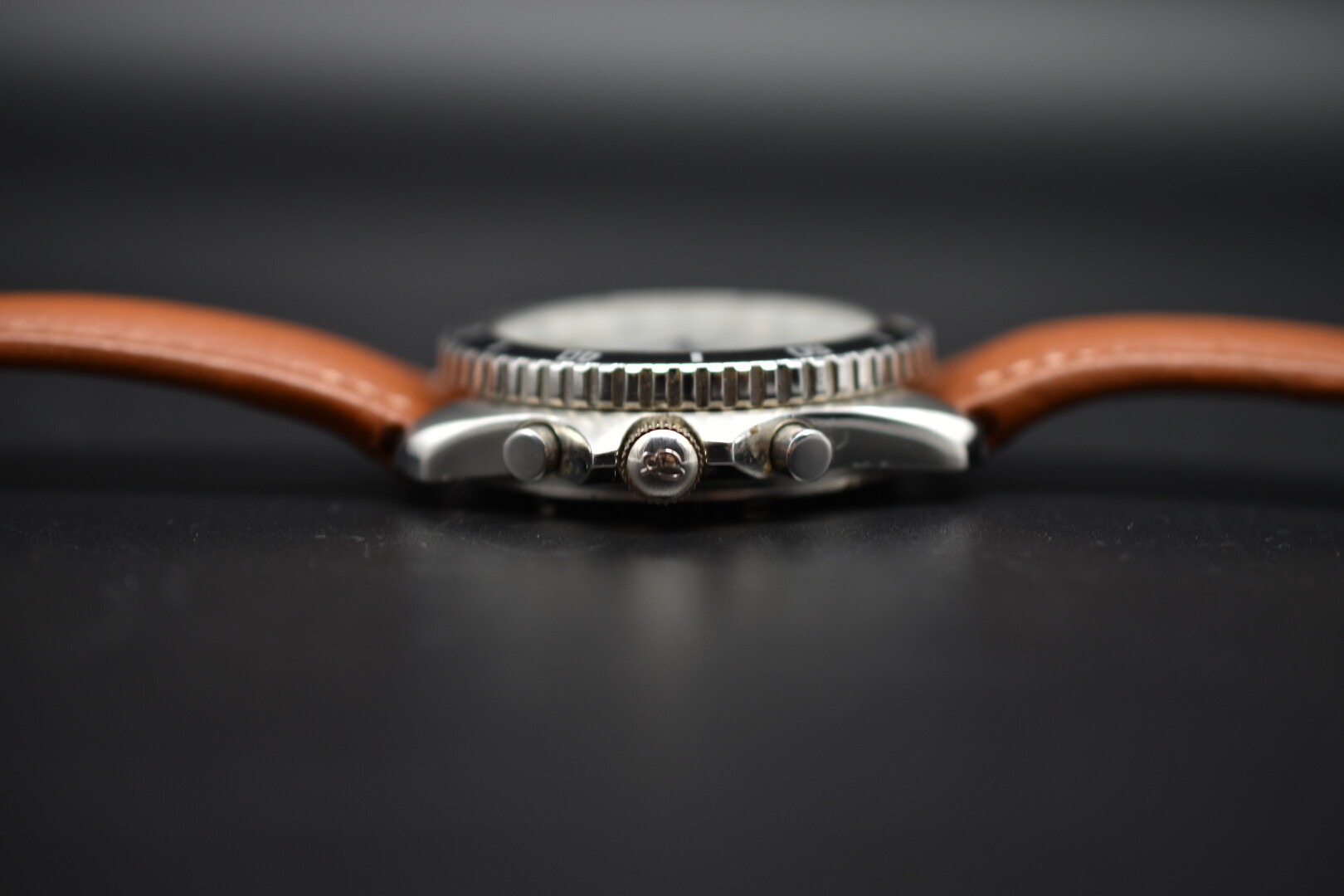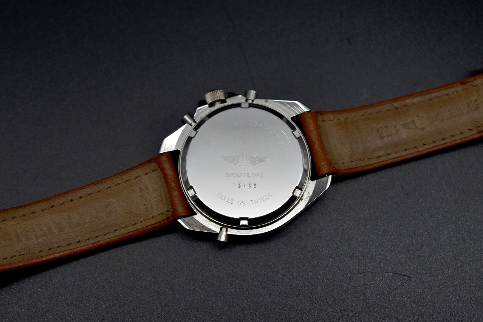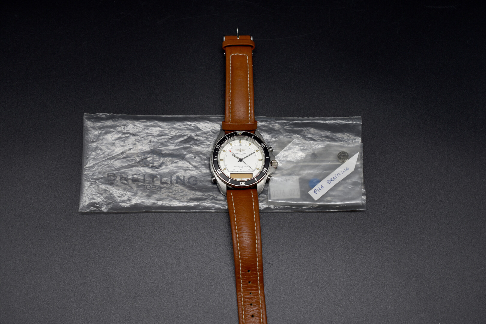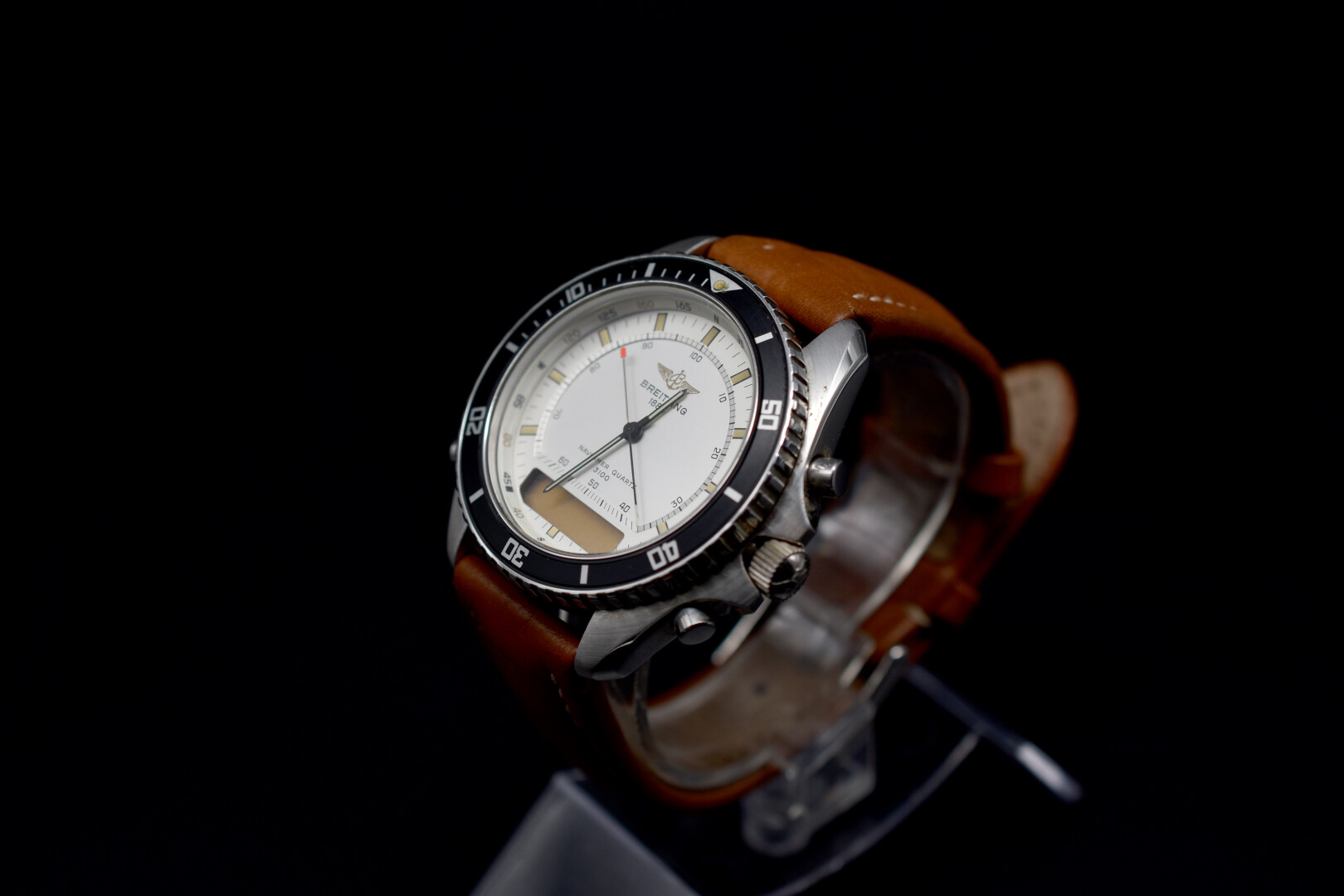 BREITLING. Montre chronographe d’homme modèle « Navitimer Quartz 3100 ». Boîtier en acier, à lunette tournante. Cadran argenté à index baton et cadran digital, signé. Bracelet cuir fauve. Numérotée 13125. Mouvement à quartz.