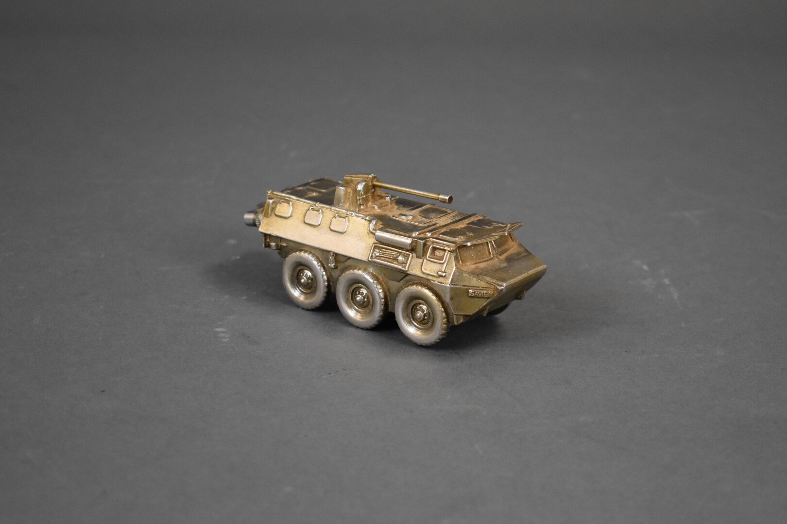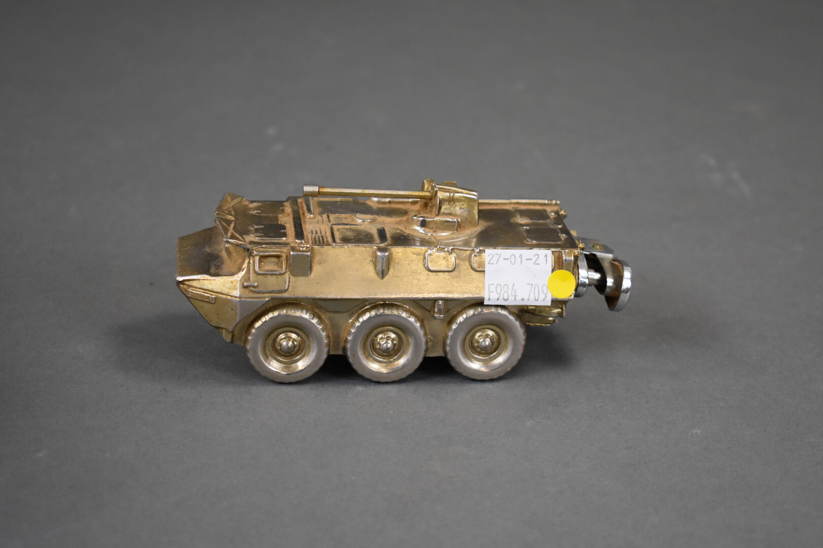Briquet en métal argenté représentant un Véhicule Avant Blindé (VAB) SAVIEM. Haut. : 6 cm.