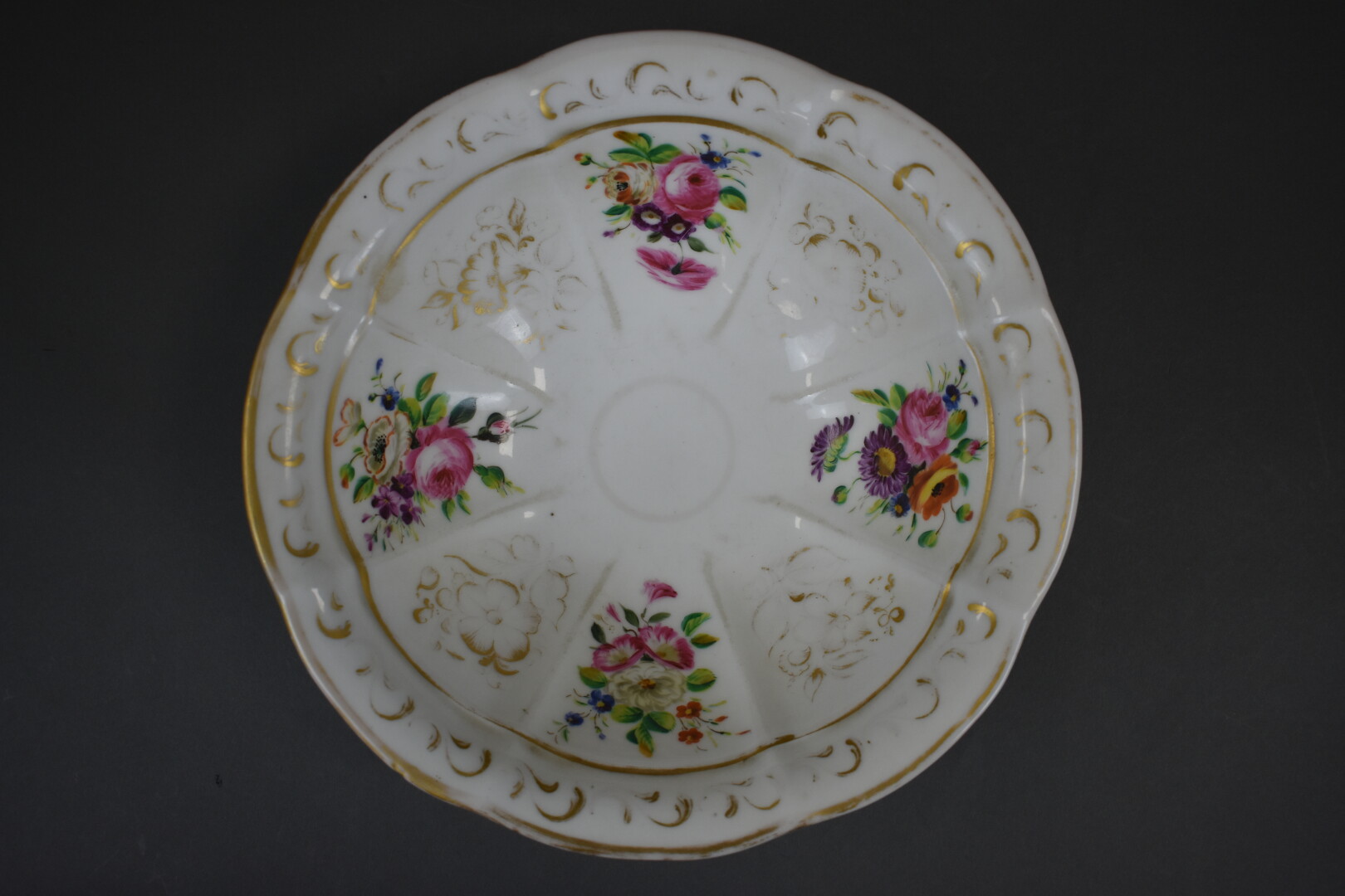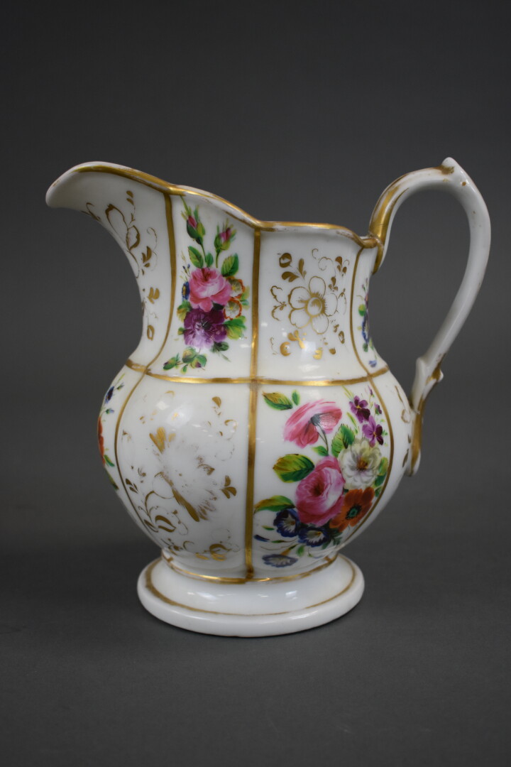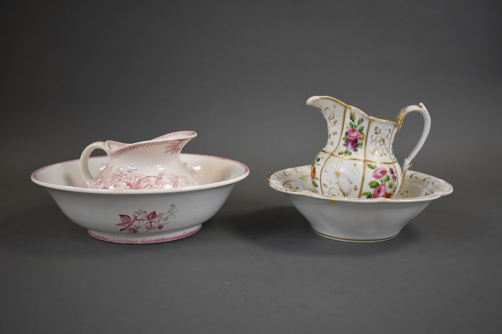 Broc et son bassin en porcelaine à décor polychrome de fleurs et dorure (usures). Paris, fin du XIXe siècle. On joint un autre broc et son bassin dépareillés en faïence de Sarreguemines à décor en rose.