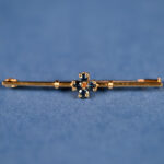 Broche barrette en or jaune 18K 750/1000e ornée de quatre petits saphirs. Long. : 4,5 g. Poids brut. : 2,3 g.