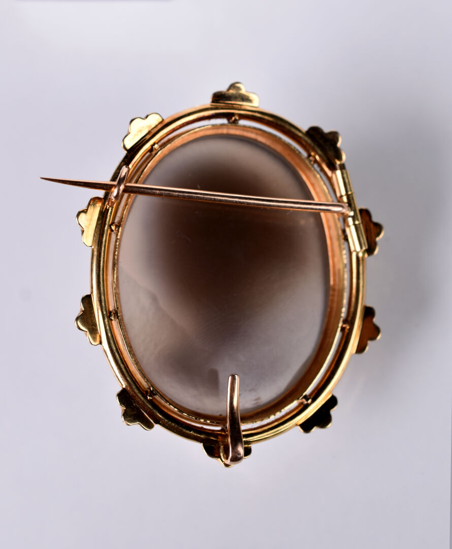 Broche camée agate brun clair figurant un portrait de femme à la chevelure nouée et au bandeau dans un liseré d’émail bleu. Garniture en or 18K 750/1000e dans un entourage émaillé bleu. 46 x 45 mm. Poids brut. : 30,60 g.