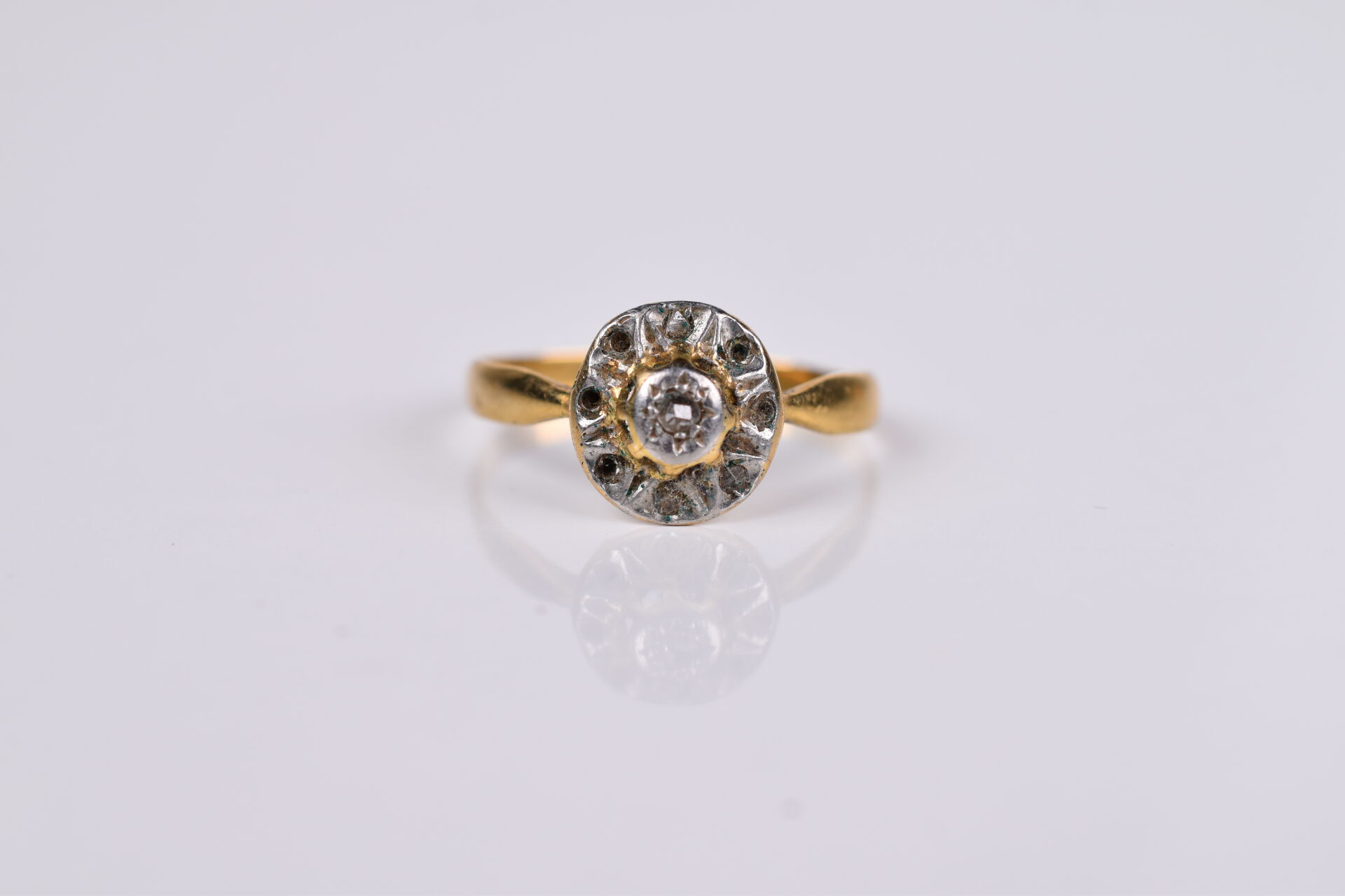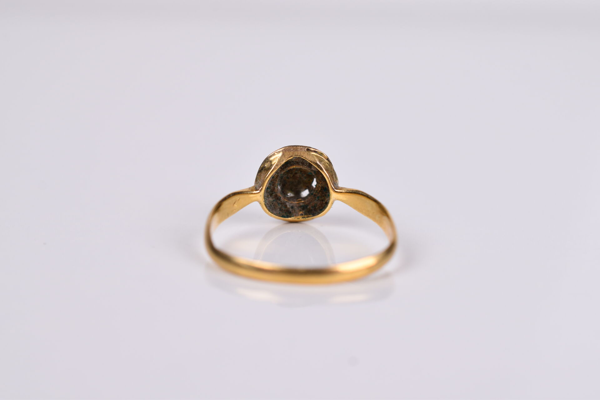 Broche camée coquillage figurant un profil de femme à la chevelure fleurie. Garniture en or 18K 750/1000e (aiguilles et accroches en métal, petits chocs). Dim. : 3 x 2,5 cm. Poids brut. : 6,6 g. On joint une bague en or 18k 750/1000e et diamantstaille rose (manques). TDD 53. Poids brut. : 1,5 g.