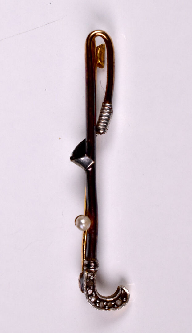 Broche « Club de golf » en argent et or jaune 18K 750/1000e orné d’une petite perle et d’une ligne de diamants taille rose. Long. : 4,3 cm. Poids brut. : 2 g.